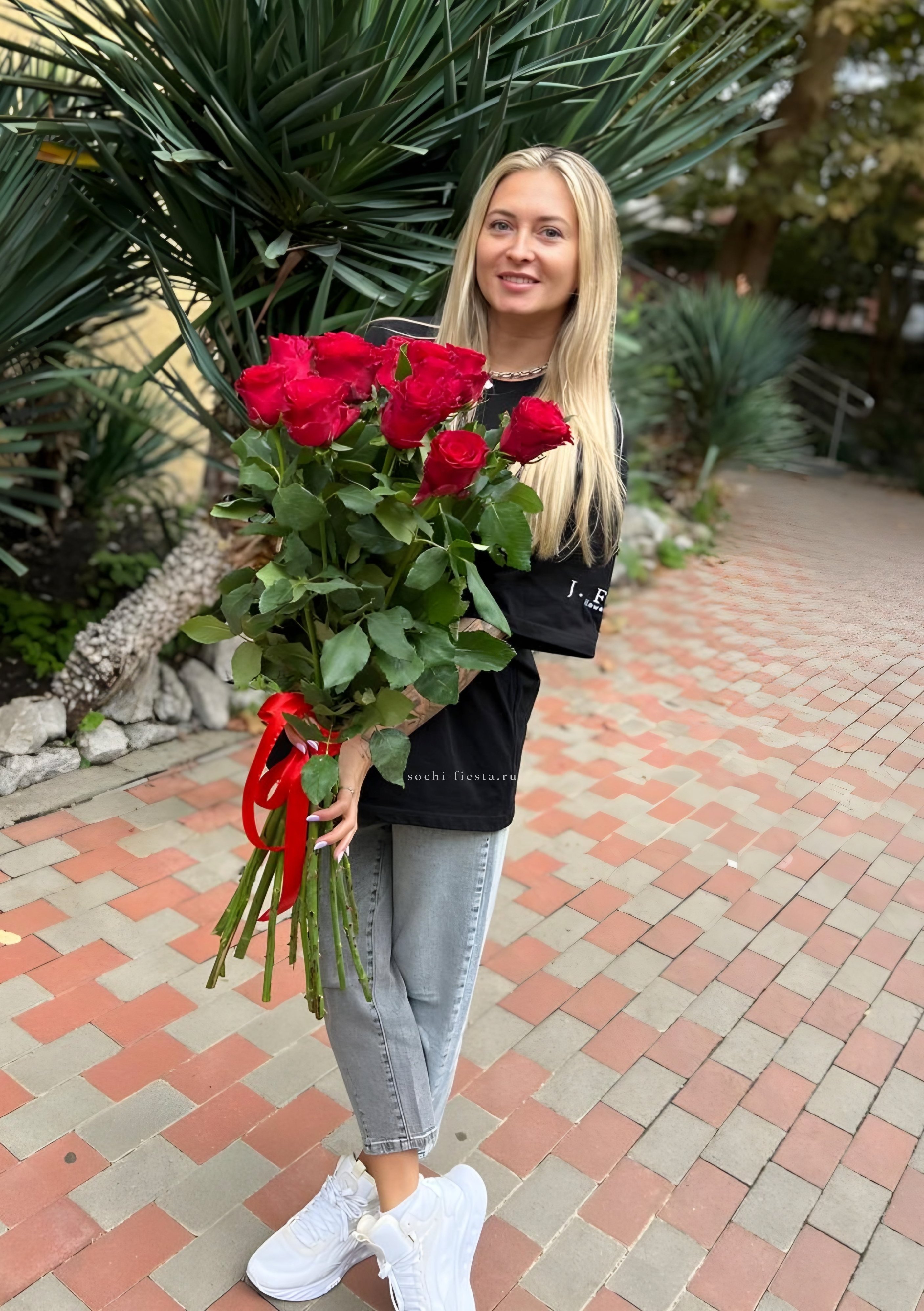 Одиннадцать французских роз выстроены в округлую композицию с веточками эвкалипта. Бутоны крупные и плотные, держат форму и наполняют пространство свежим присутствием.