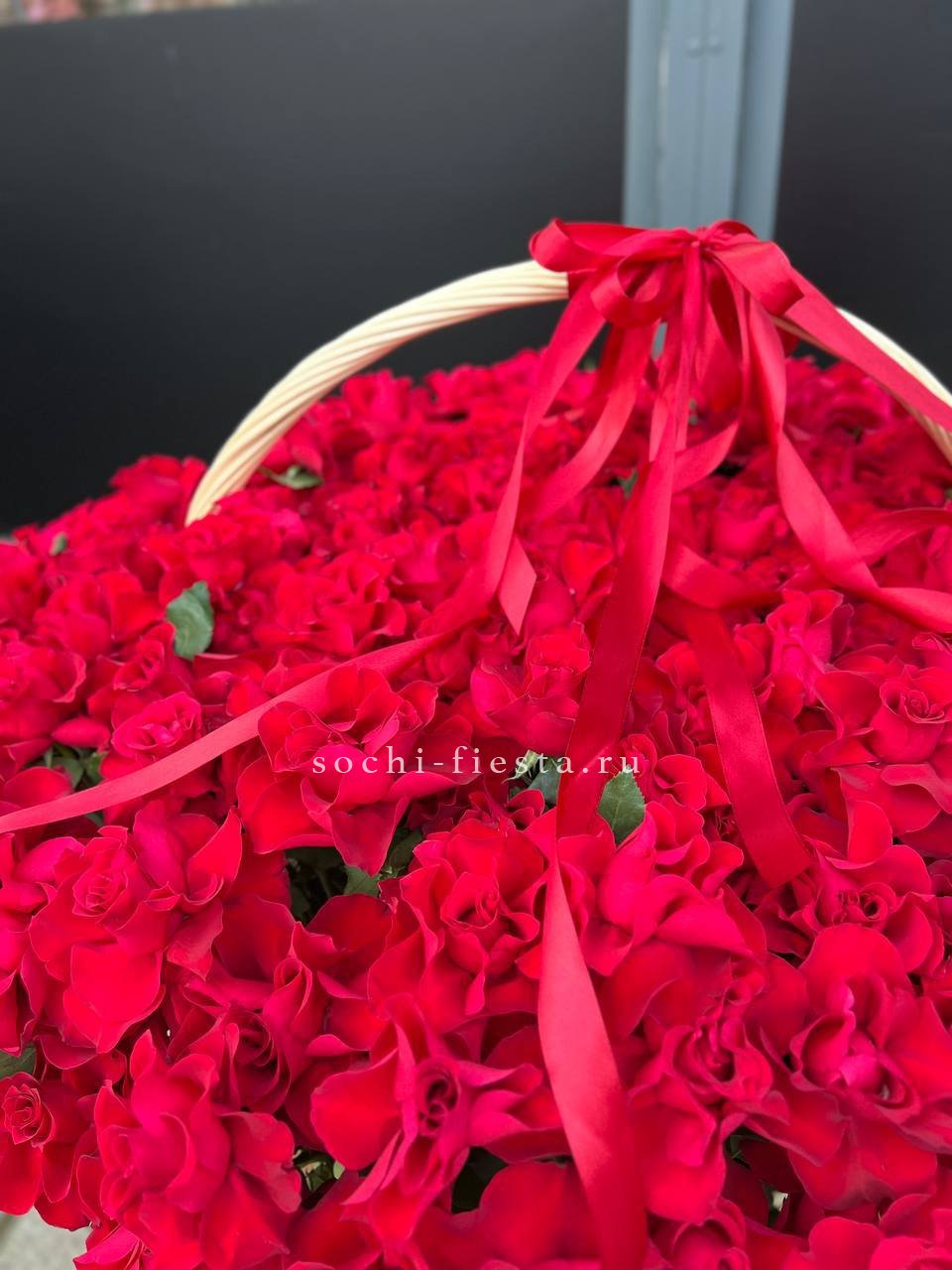 Двести одна роза глубокого красного оттенка собрана в просторной корзине. Плотное заполнение создает цельную бархатистую поверхность, где каждый бутон дополняет соседний. Масштабная композиция для выражения самых сильных чувств.