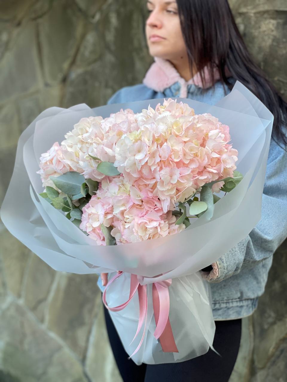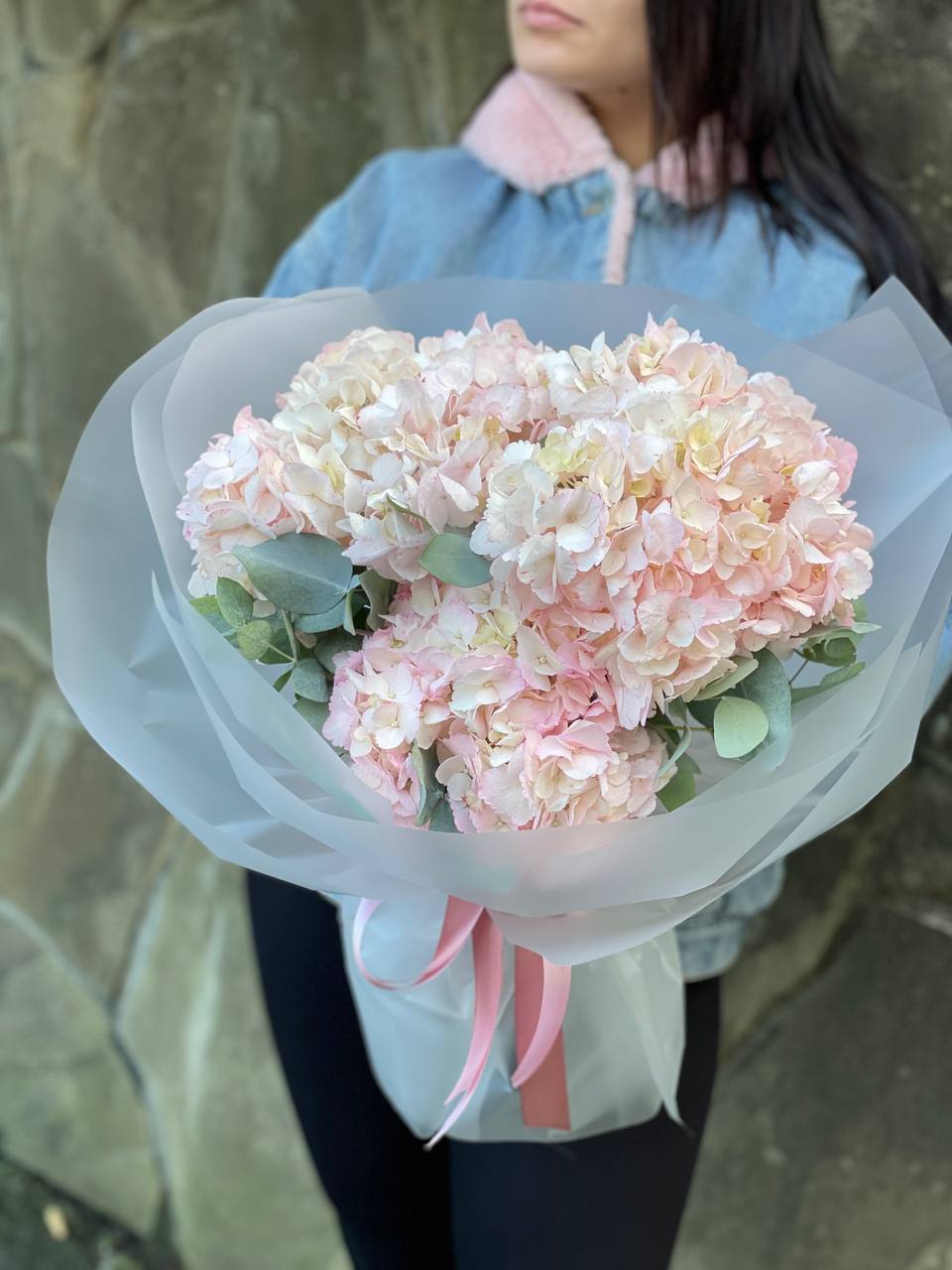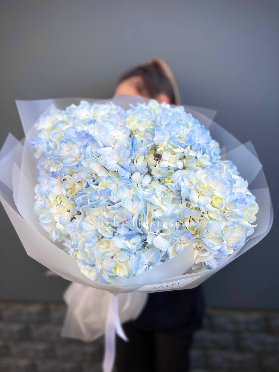 Воздушные шапки гортензий создают объёмную основу, а белые розы добавляют графичности. Голубой оттенок освежает композицию и делает её запоминающейся.