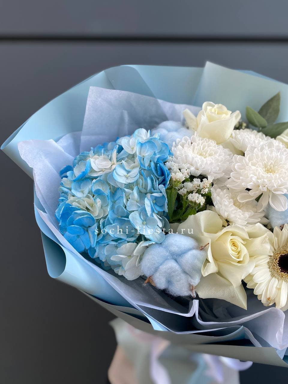 гортензия, хризантема, белая роза, гербера, статица, хлопок, упаковка.