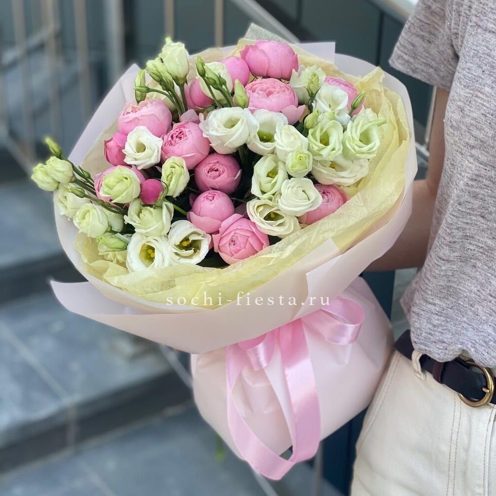 кустовые розы, эустома, хлопок, лента и дизайнерская пленка.