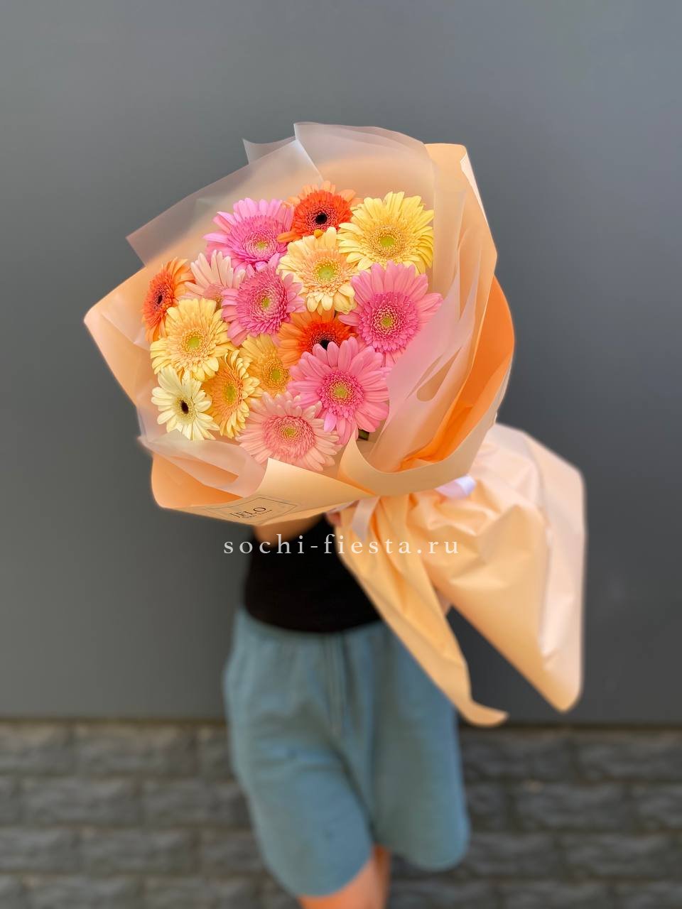 Пятнадцать гербер собраны в плотную округлую форму, где каждый цветок раскрыт навстречу свету. Яркая палитра создаёт ощущение летнего дня, застывшего в лепестках.
