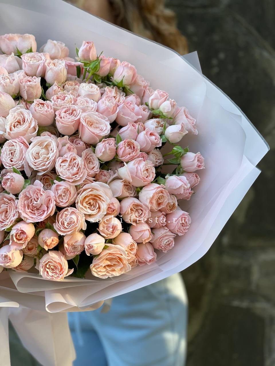 Пионовидные розы раскрываются густыми лепестками, хамелациум добавляет воздушности. Композиция держит форму и долго сохраняет свежесть.