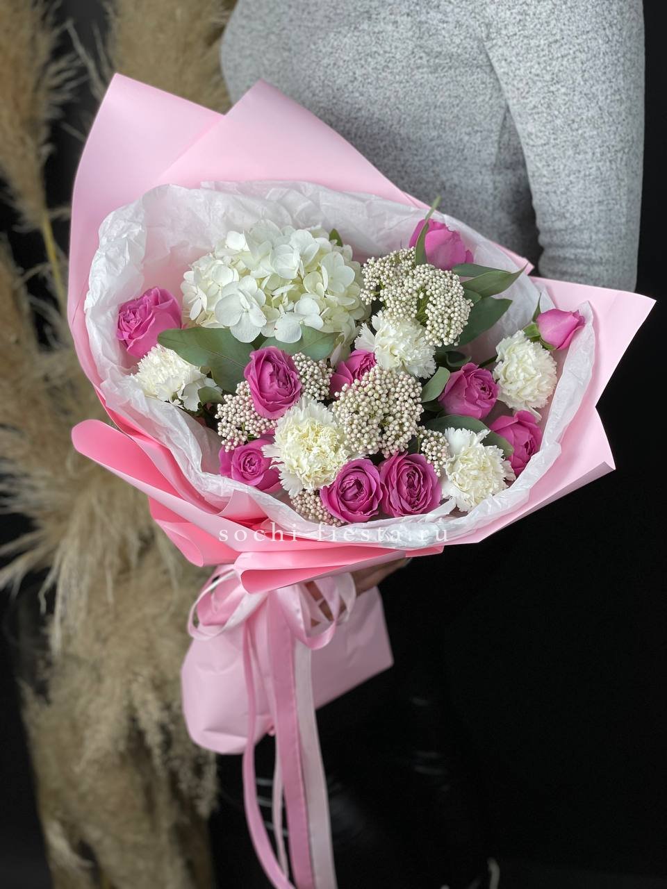 Розовая гортензия и эустома раскрывают свою красоту в каждом лепестке. Мягкие оттенки переходят один в другой, создавая спокойное и гармоничное впечатление.