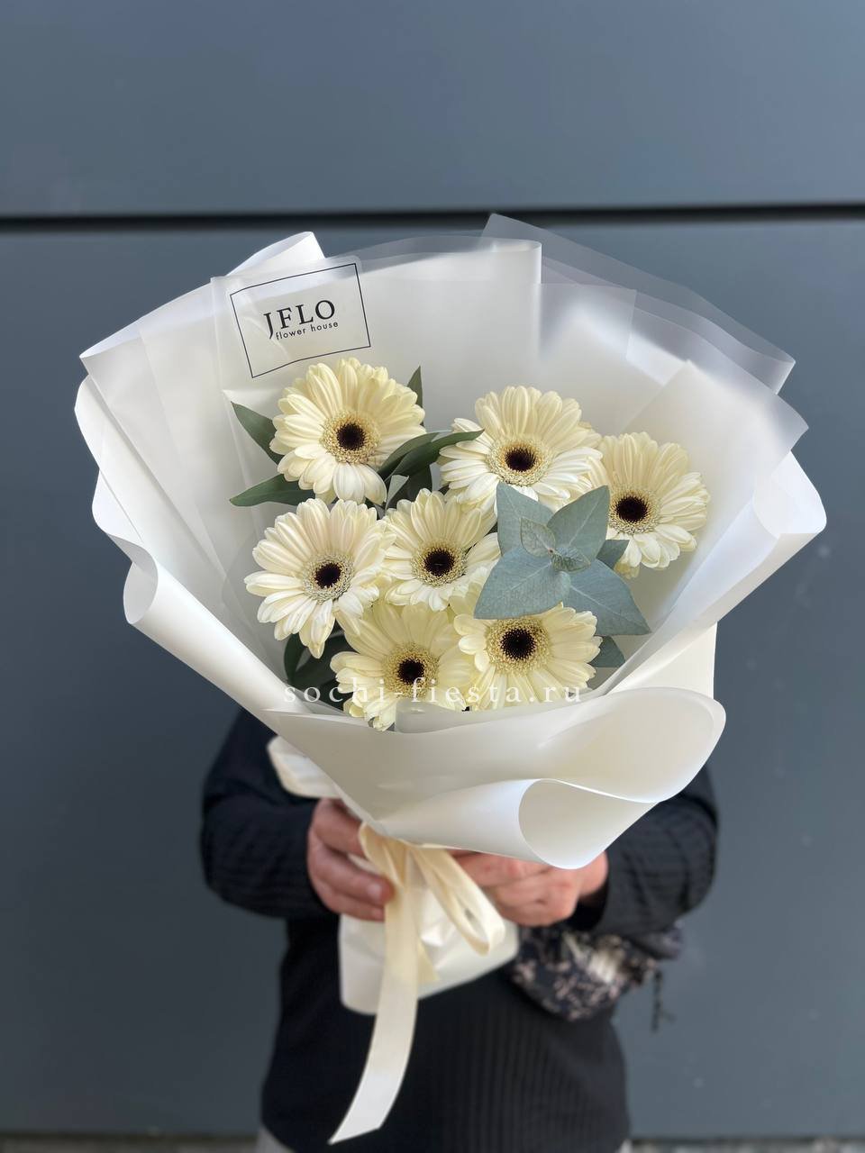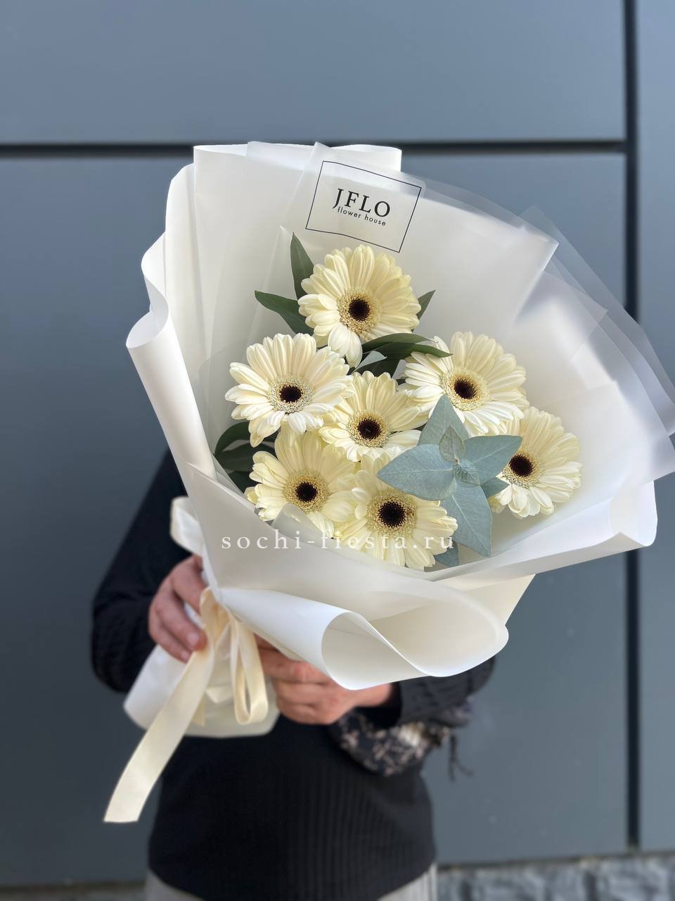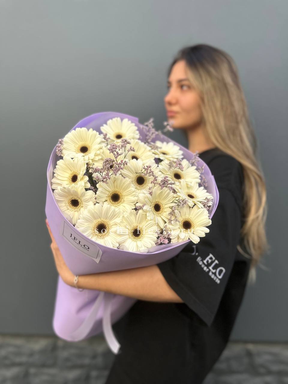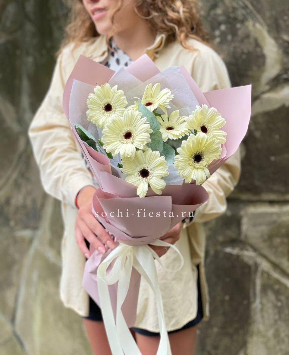 Голландские герберы сорта Solare дополнены воздушным лимониумом, который создаёт лёгкую дымку вокруг ярких головок. Дизайнерская упаковка завершает композицию, удобную для размещения в любом интерьере.