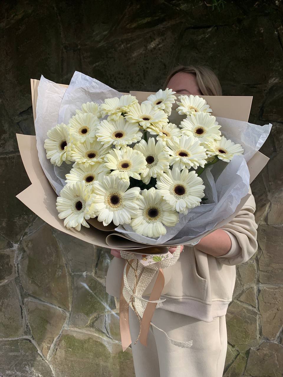голландская гербера 15 шт., лимониум,  лента, дизайнерская упаковка.