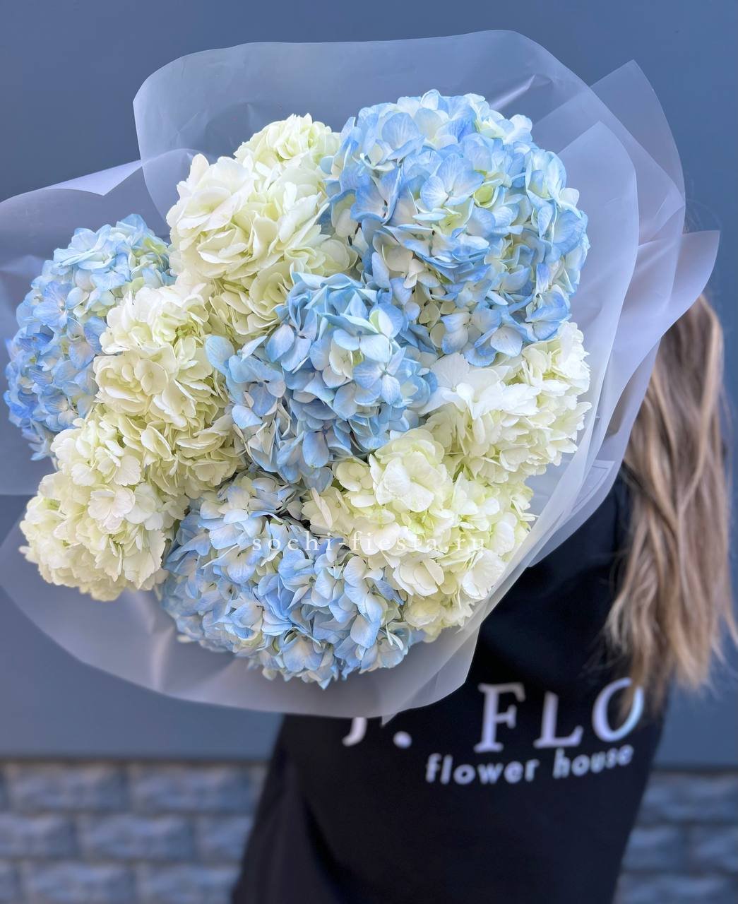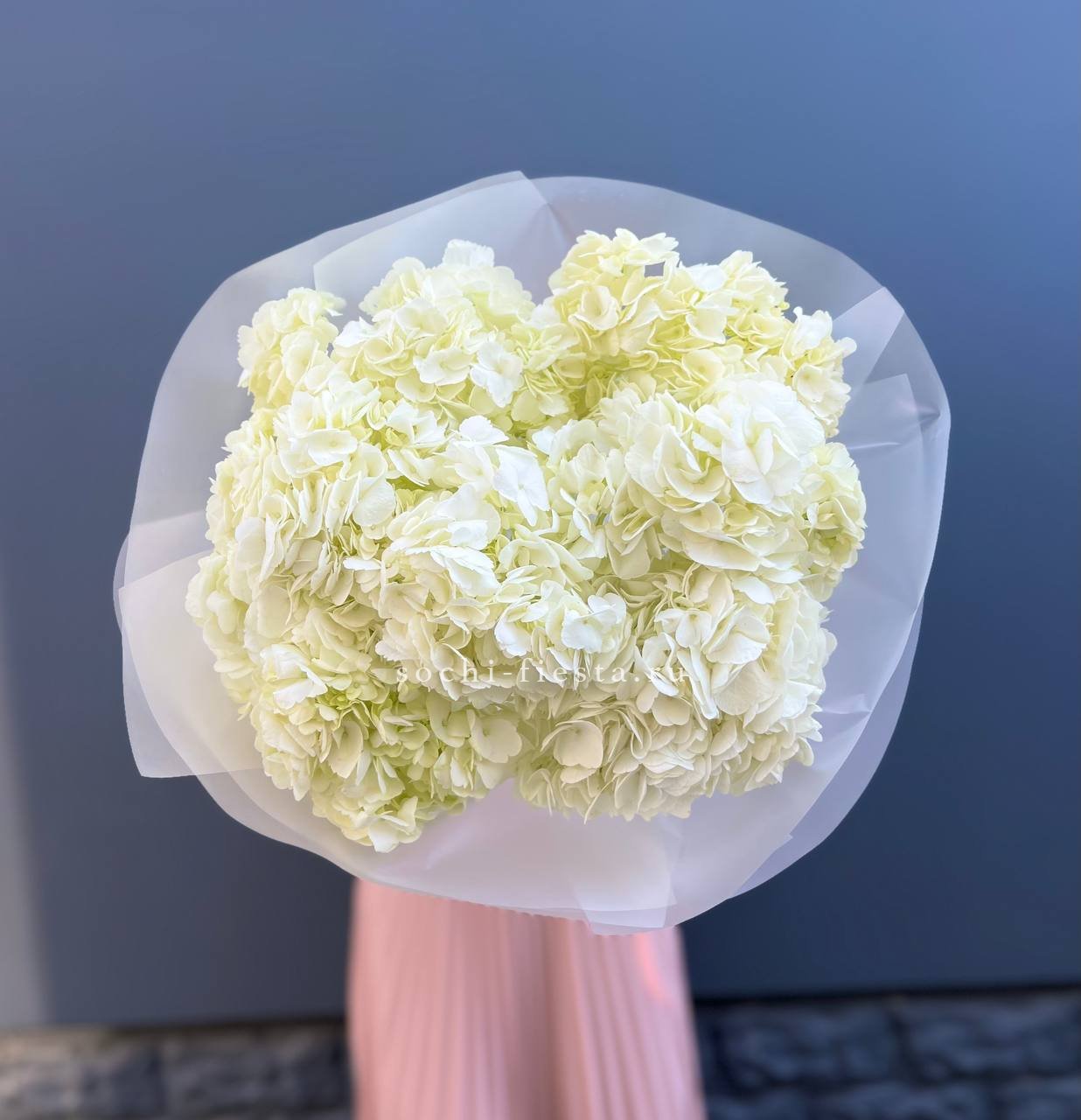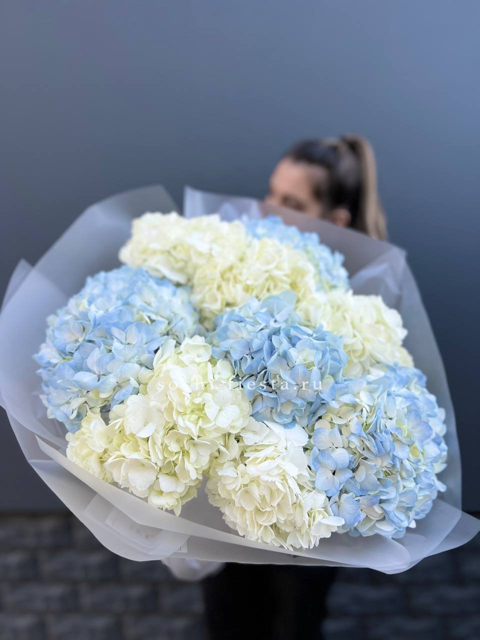 Двадцать пять соцветий гортензий разных оттенков формируют пышное облако с естественной игрой цвета. Каждая головка раскрывается по-своему, создавая живую фактуру без четких границ между тонами.