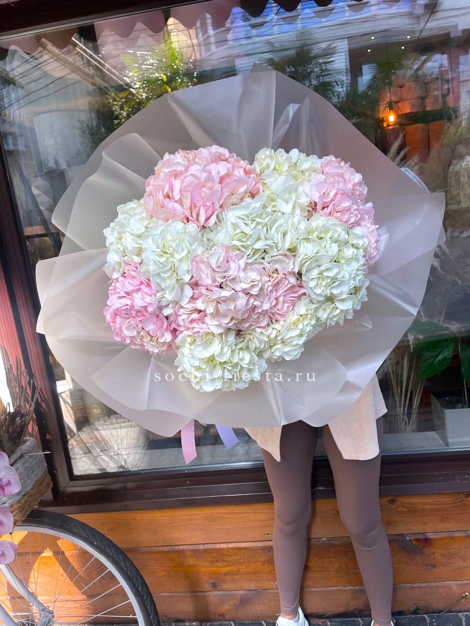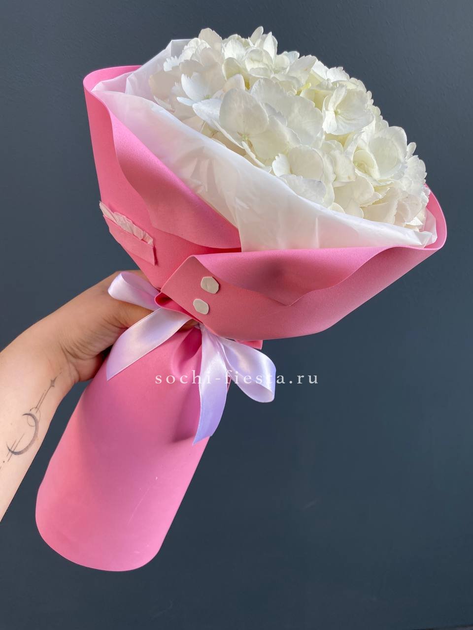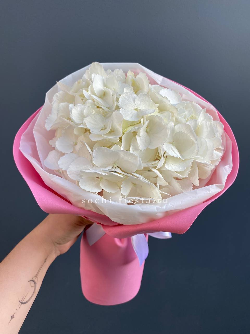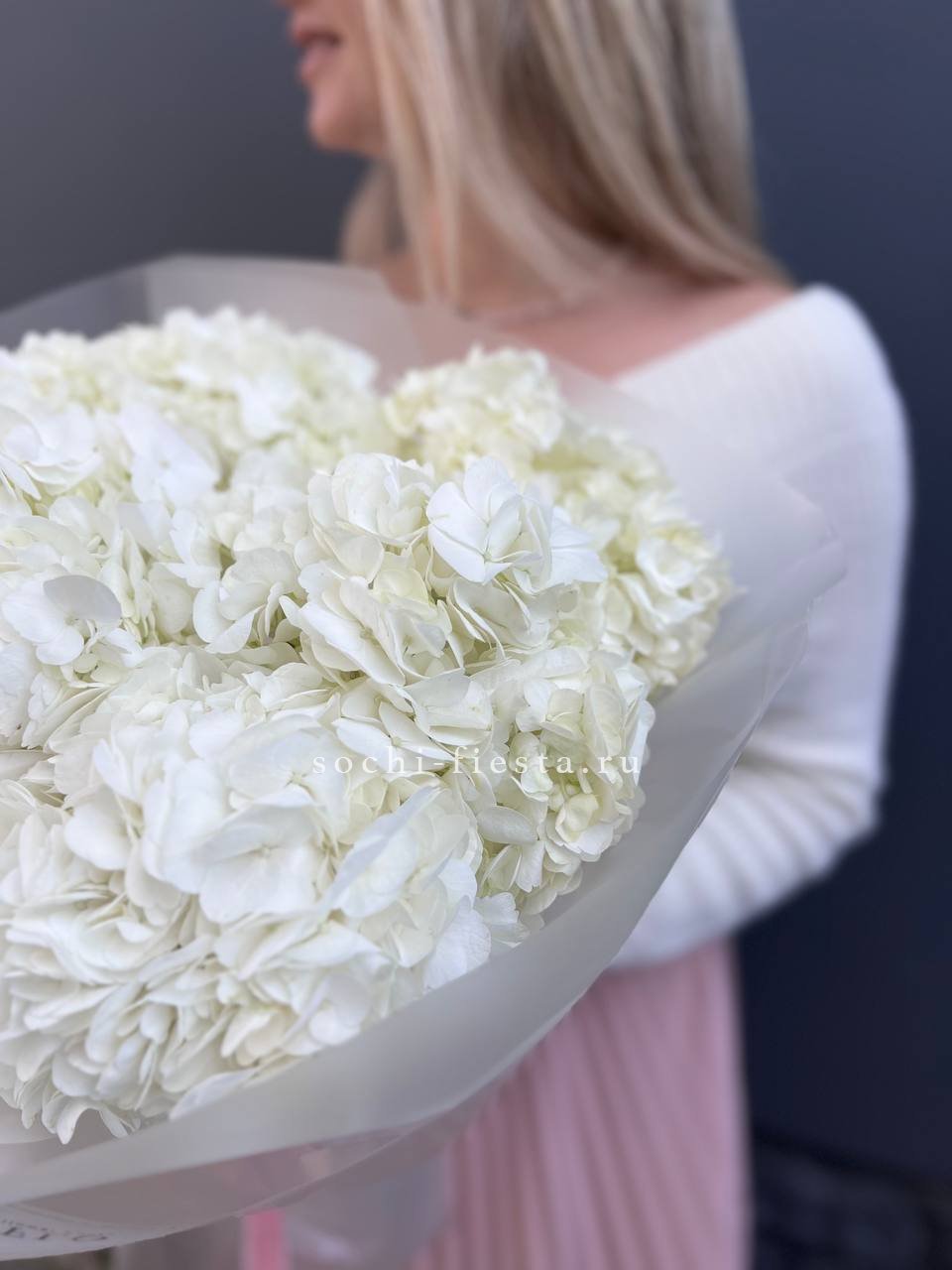 Двадцать пять соцветий гортензий разных оттенков формируют пышное облако с естественной игрой цвета. Каждая головка раскрывается по-своему, создавая живую фактуру без четких границ между тонами.