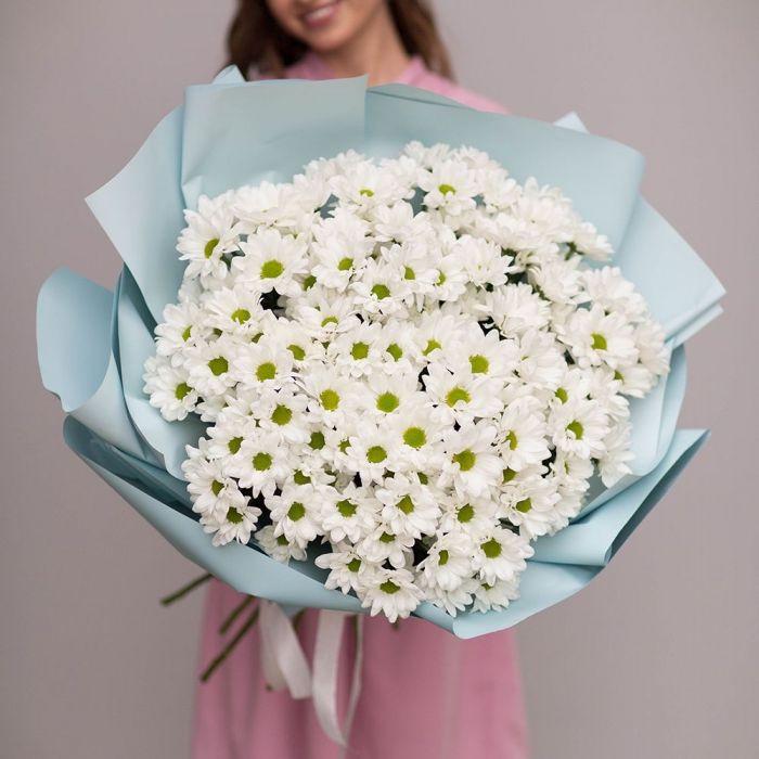 Fifteen веток кустовой хризантемы образуют пышное облако из множества мелких бутонов. Простая упаковка не отвлекает от густоты соцветий и их природной фактуры. Букет долго сохраняет свежесть и объём.