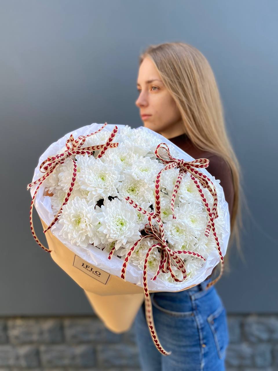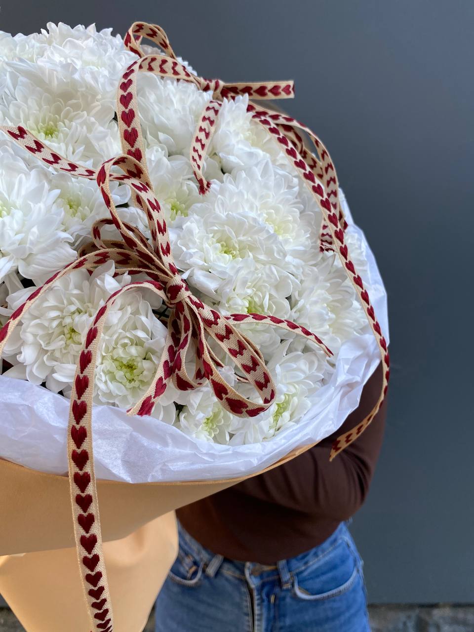 хризантема кустовая - 5 шт., лента, дизайнерская пленка.