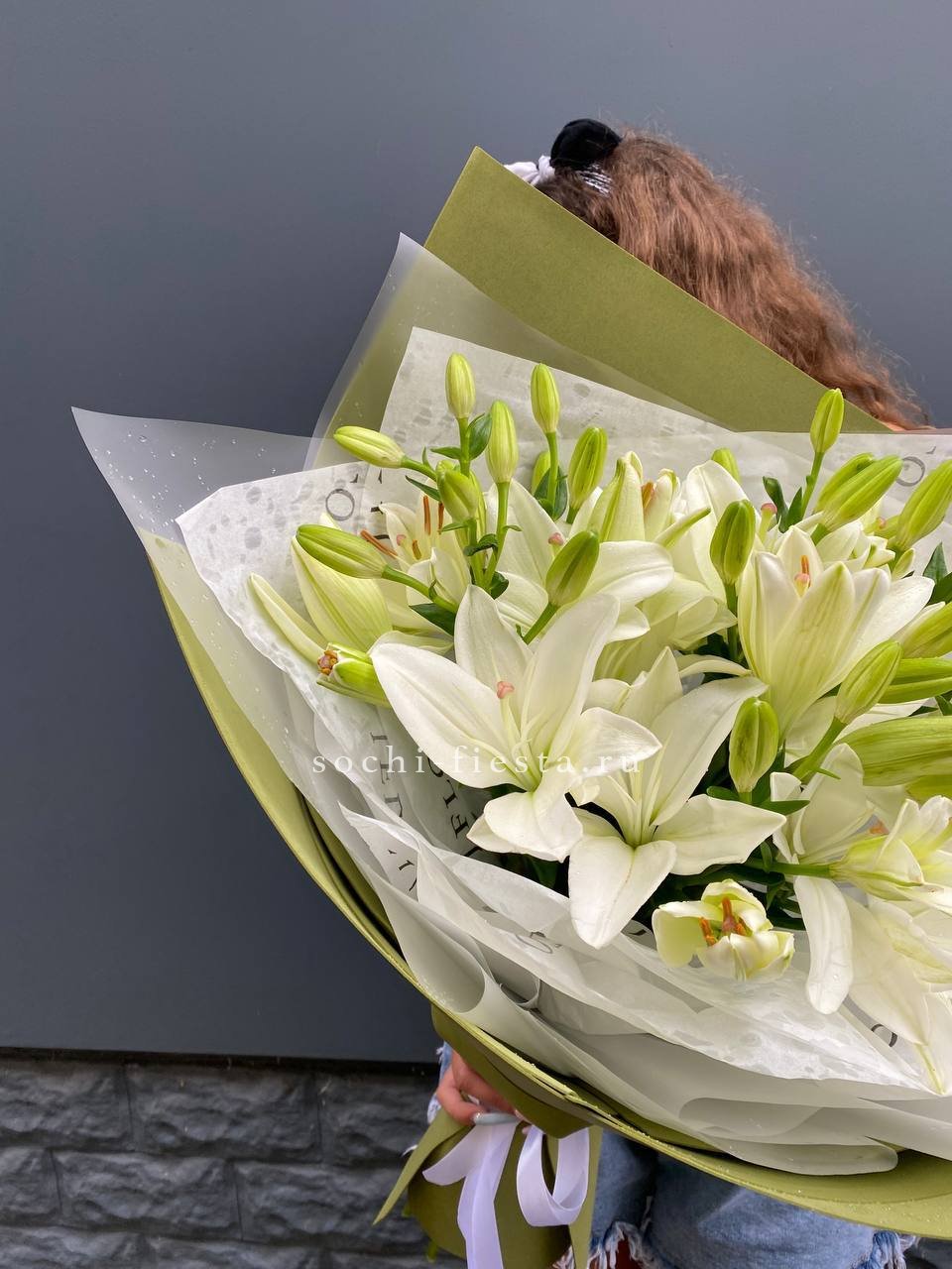 белые лилии - 5 шт., крафт, дизайнерская пленка.