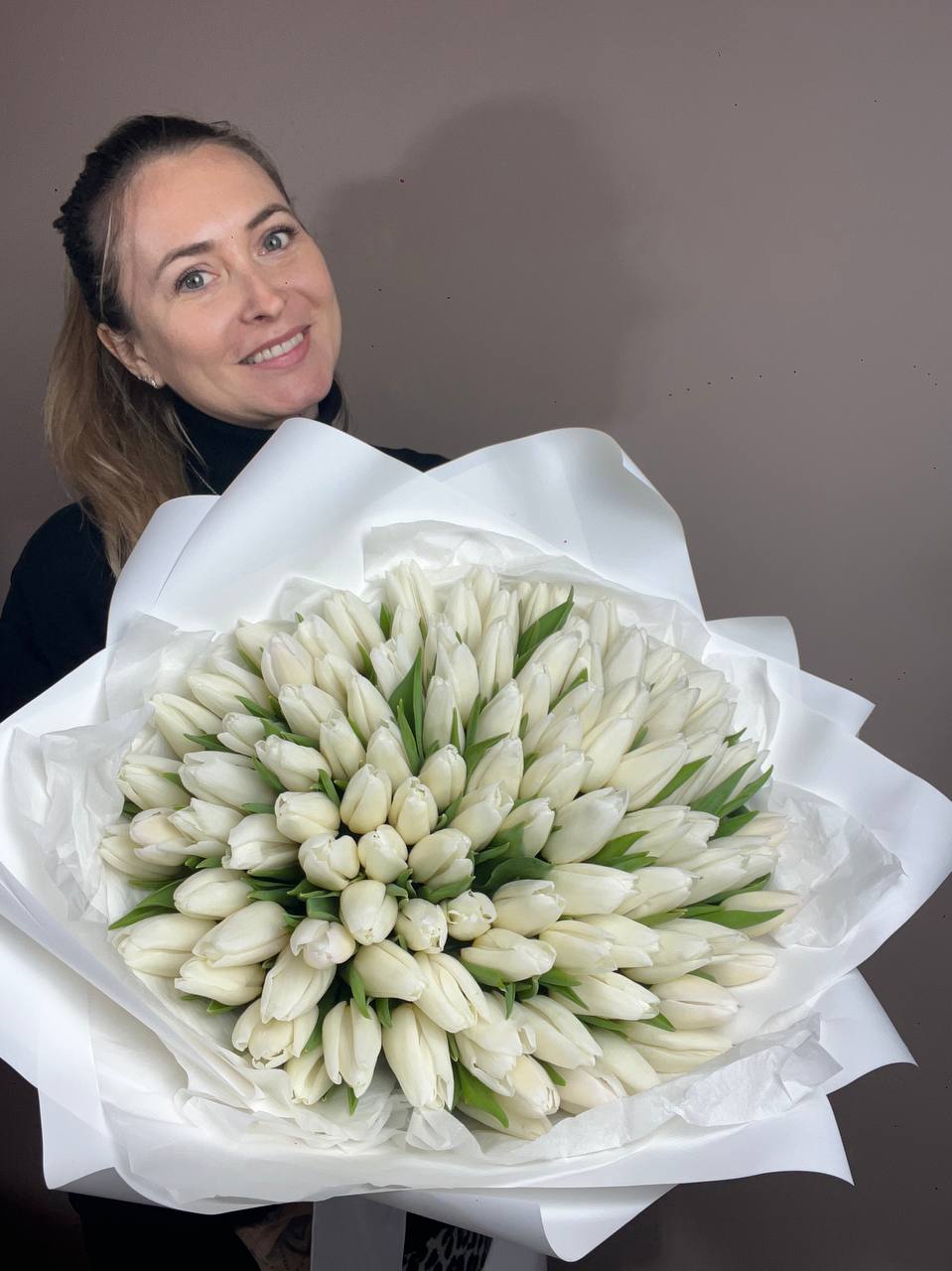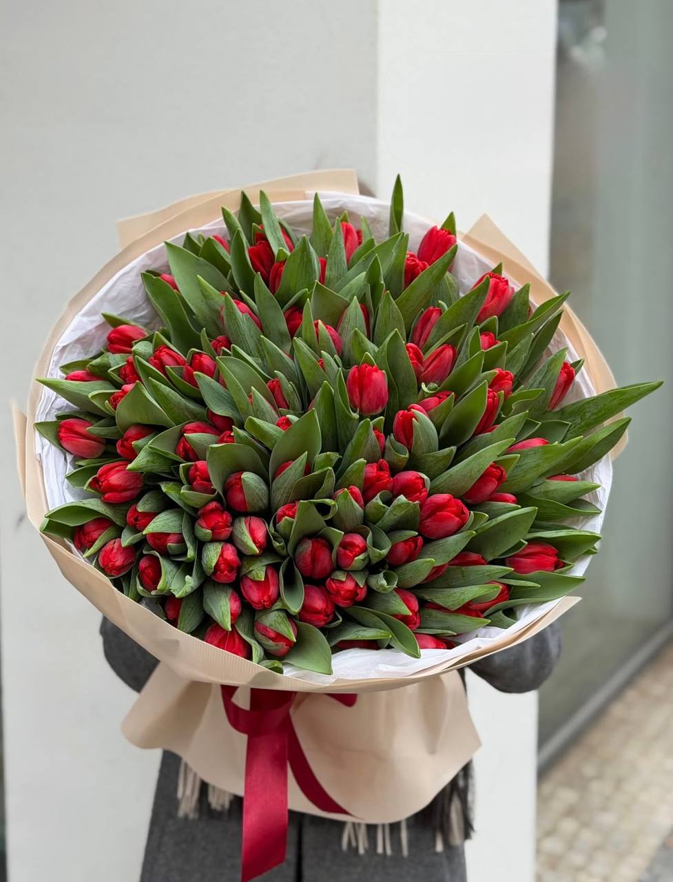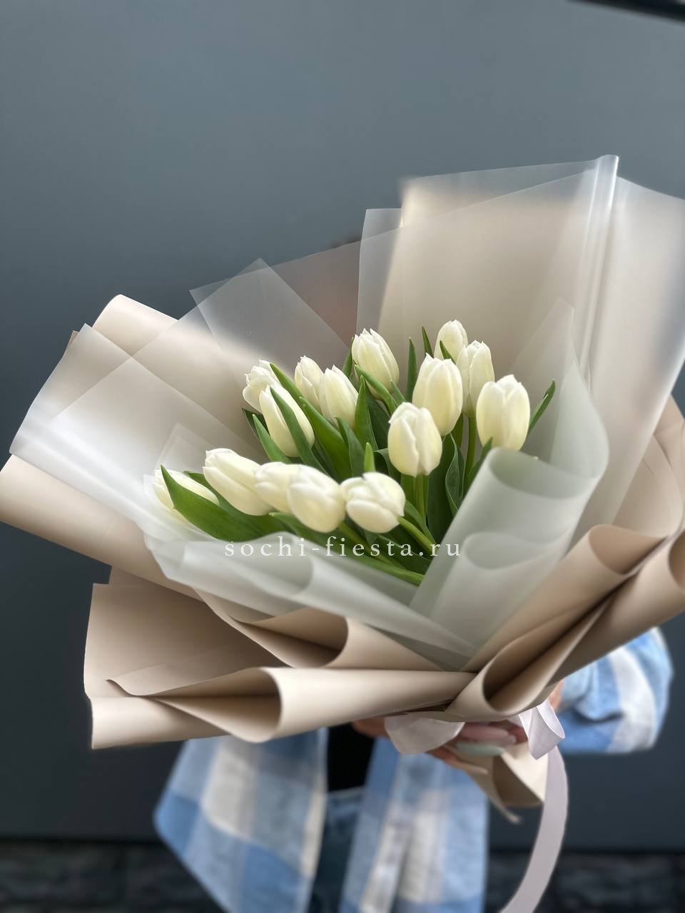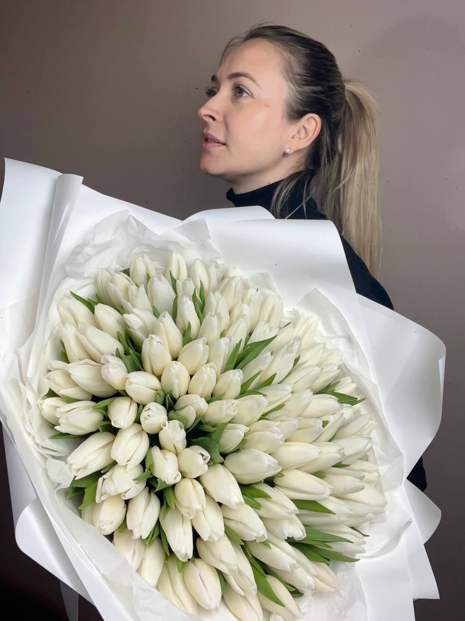 Одиннадцать тюльпанов в дизайнерском оформлении подойдут для весеннего жеста внимания. Цвет бутонов можно выбрать по вашему желанию.