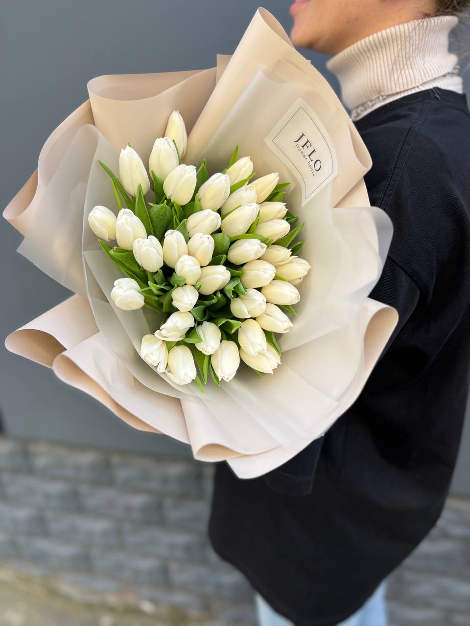 Тридцать пять тюльпанов собраны в плотный монохромный букет, где белизна лепестков создаёт почти графичное впечатление. Чистая форма без лишних деталей позволяет раскрыться природной архитектуре каждого бутона.