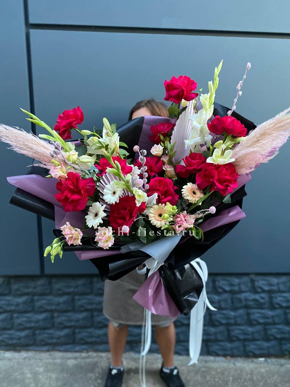 Вертикальные линии гладиолусов и пушистые метёлки пампасной травы задают динамику всей композиции. Красные розы и герберы переплетаются с белоснежными эустомами и лилиями, создавая многослойный объём. Авторская работа для тех, кто ценит выразительность формы.