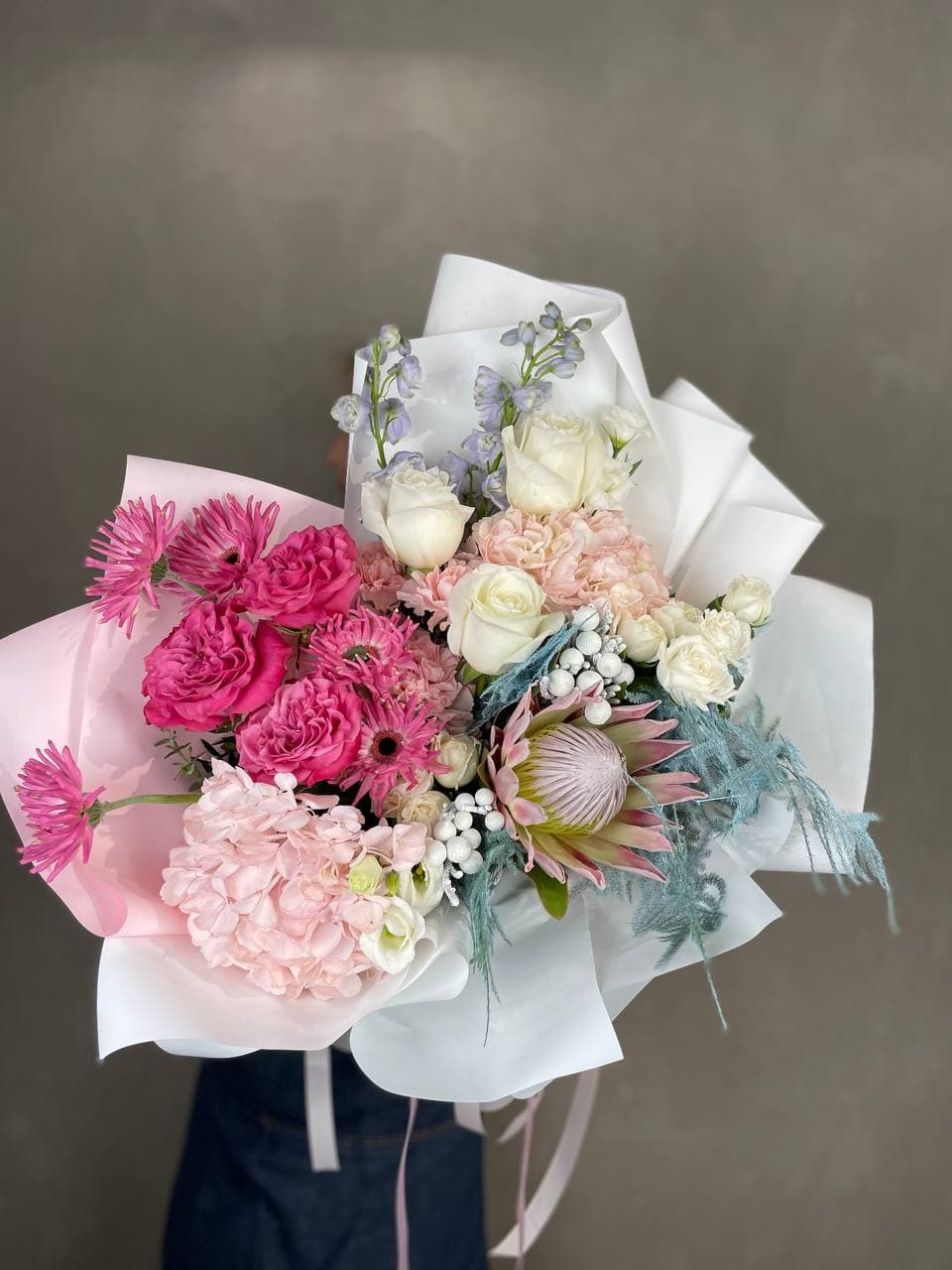 Пышные шапки гортензии и кустовые розы образуют плотную композицию с выраженным объёмом. Серебристая бруния и эвкалипт добавляют графичности, а диантусы разбивают крупные формы лёгкими вкраплениями. Авторская сборка с продуманной структурой и естественной пластикой.
