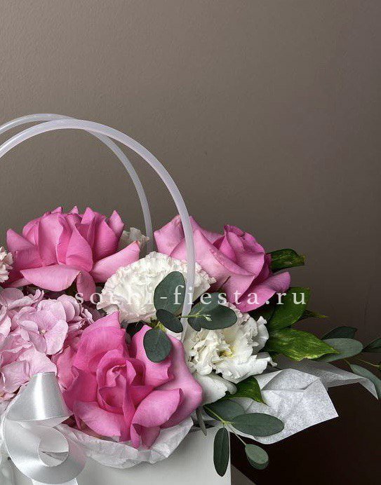 гортензия, кустовые розы, эвкалипт, ваксфлауэр (или аналог), лента, цилиндр D20.