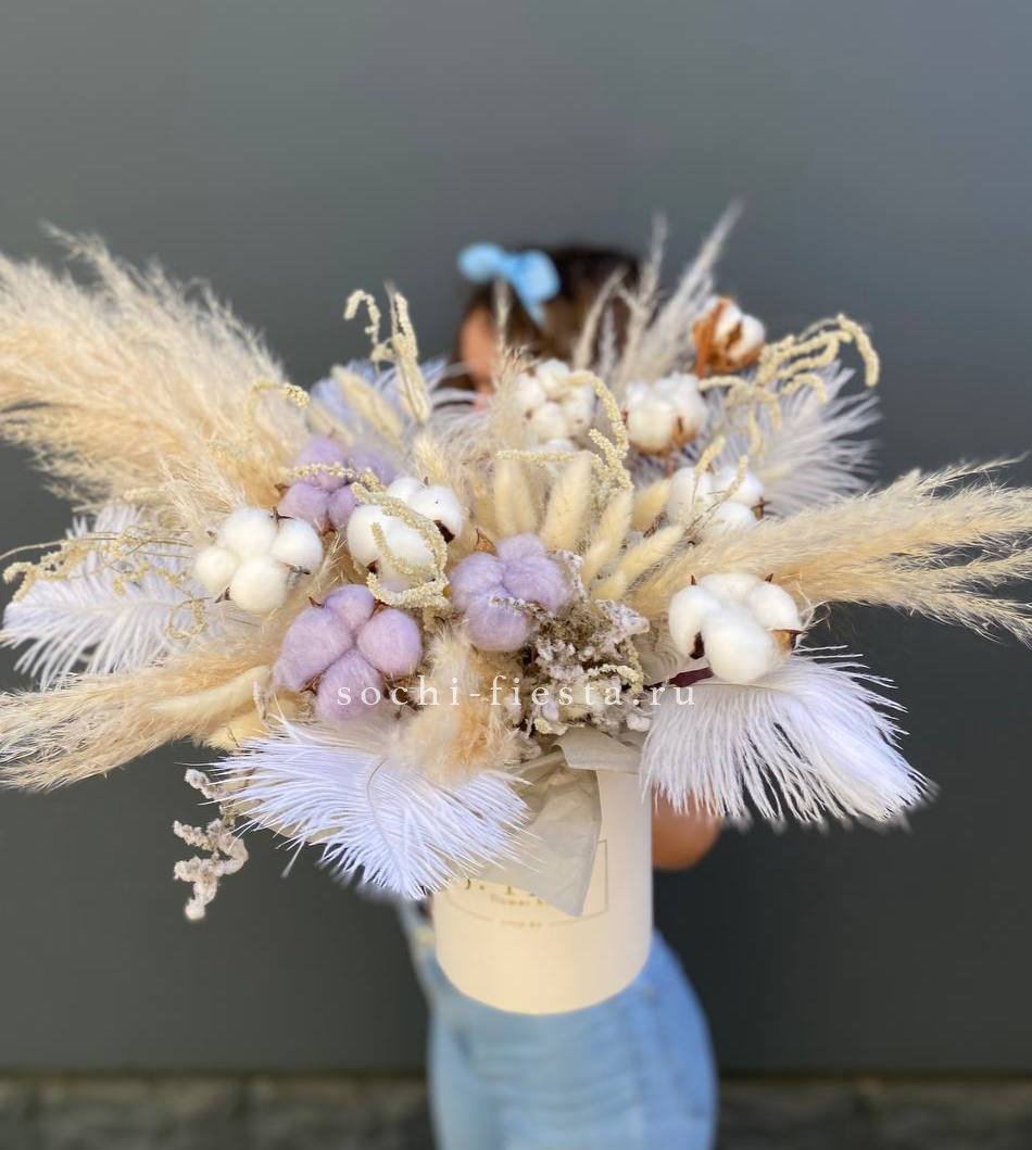 Композиция собрана из белых лилий и мелких соцветий в лавандовых и розовых тонах. Цилиндр объединяет цветы разной высоты и создает впечатление летнего букета в компактной форме.