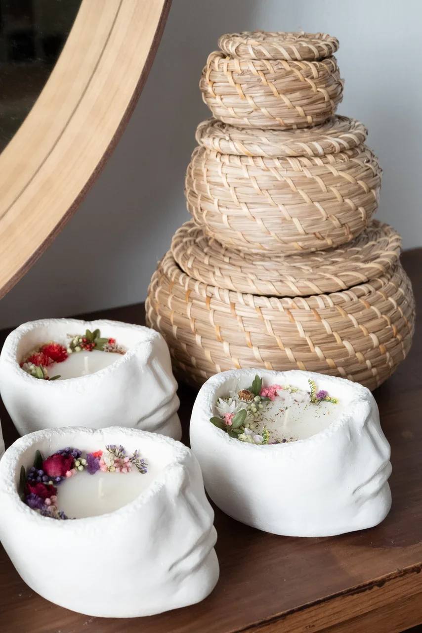 свеча из гипса, кокосовый воск 100% (экологично и не оставляет следов), украшена сухоцветами, время горения 30ч, аромат свечи не выветривается около года.