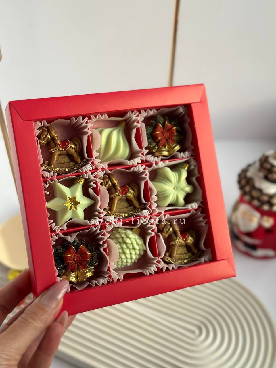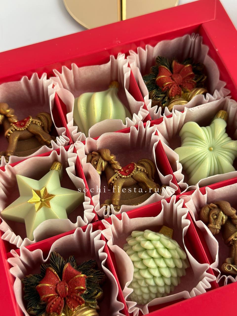 Девять шоколадных игрушек с ручной росписью: миниатюрные лошадки и колокольчики из бельгийского шоколада. Каждая фигурка прорисована вручную и готова украсить праздничный стол или стать частью новогоднего настроения.