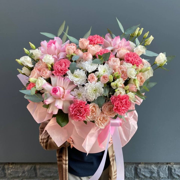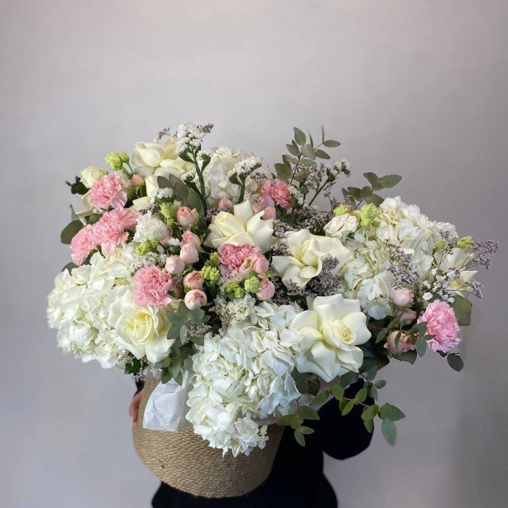 Наполнение подбирается под сезон. Зимой — амариллис, розы, ранункулюсы. Весной — тюльпаны, ранункулюсы, фрезия. Летом — пионы в мае-июне, гортензия в июле-августе. Осенью — хризантемы и декоративные травы.
