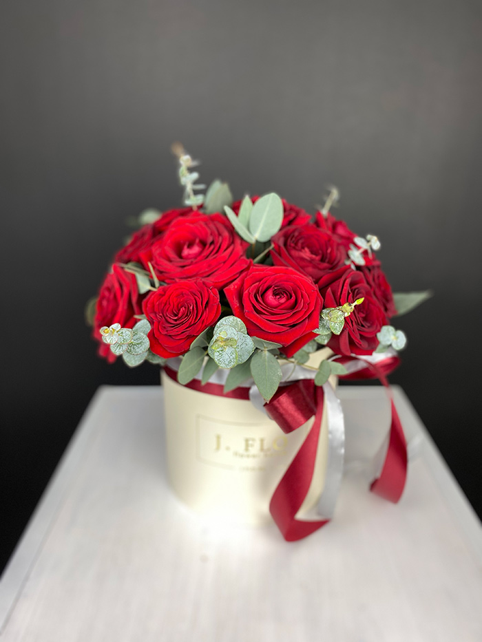 Эустомы и пионовидные розы соседствуют с французскими макарон в коробке в форме сердца. Диантусы и эвкалипт создают объём, а сладкий акцент делает композицию завершённой.