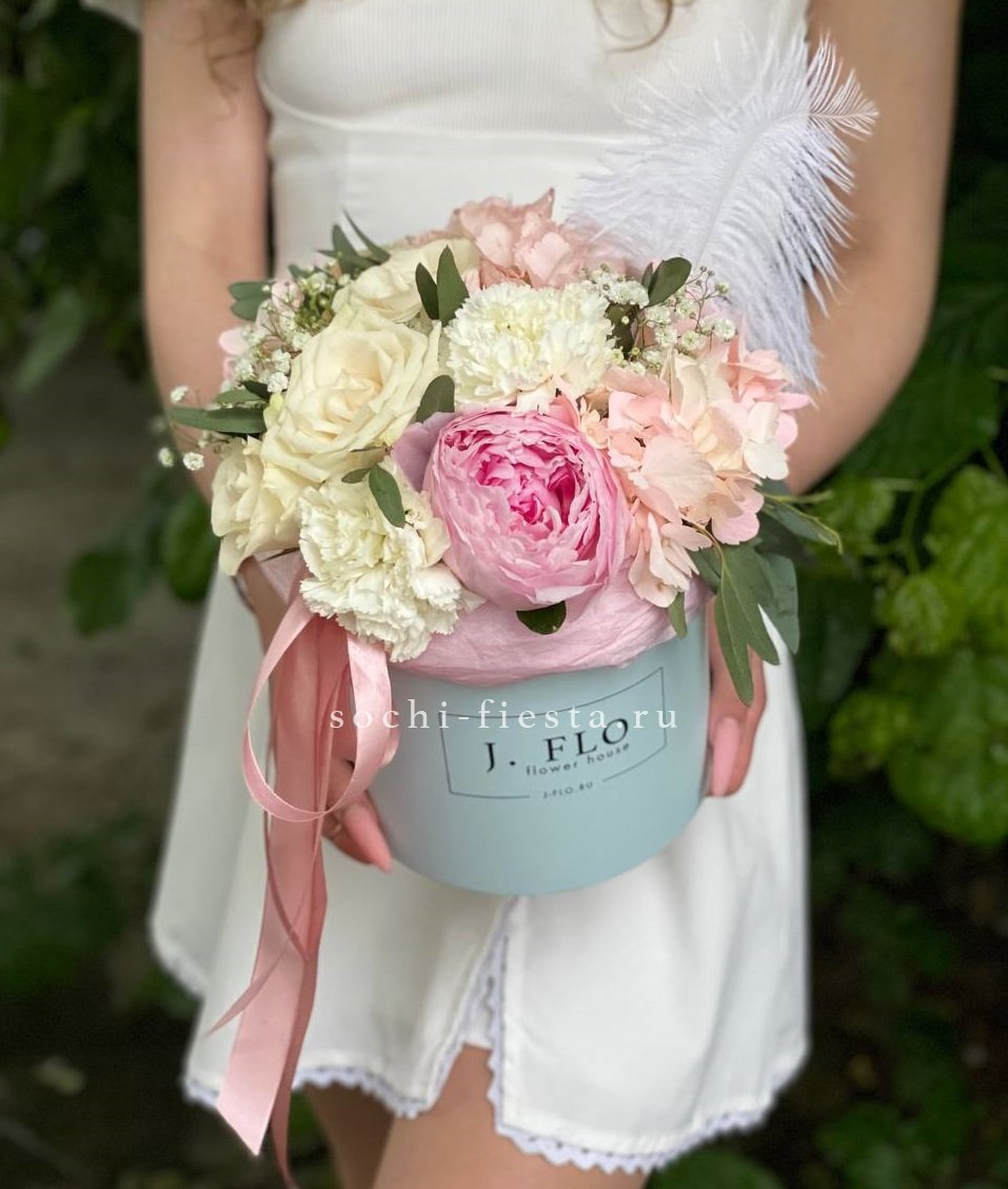 пион, гортензия, розы одноголовые, диантусы, ветка гипсофилы (или замена вне сезона), перо (или аналог по согласованию), эвкалипт, цилиндр D16.