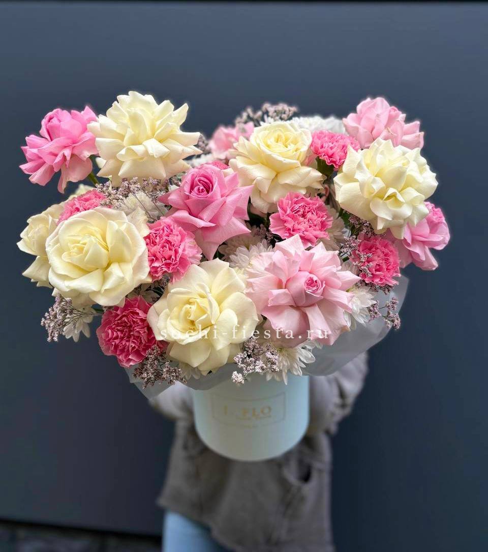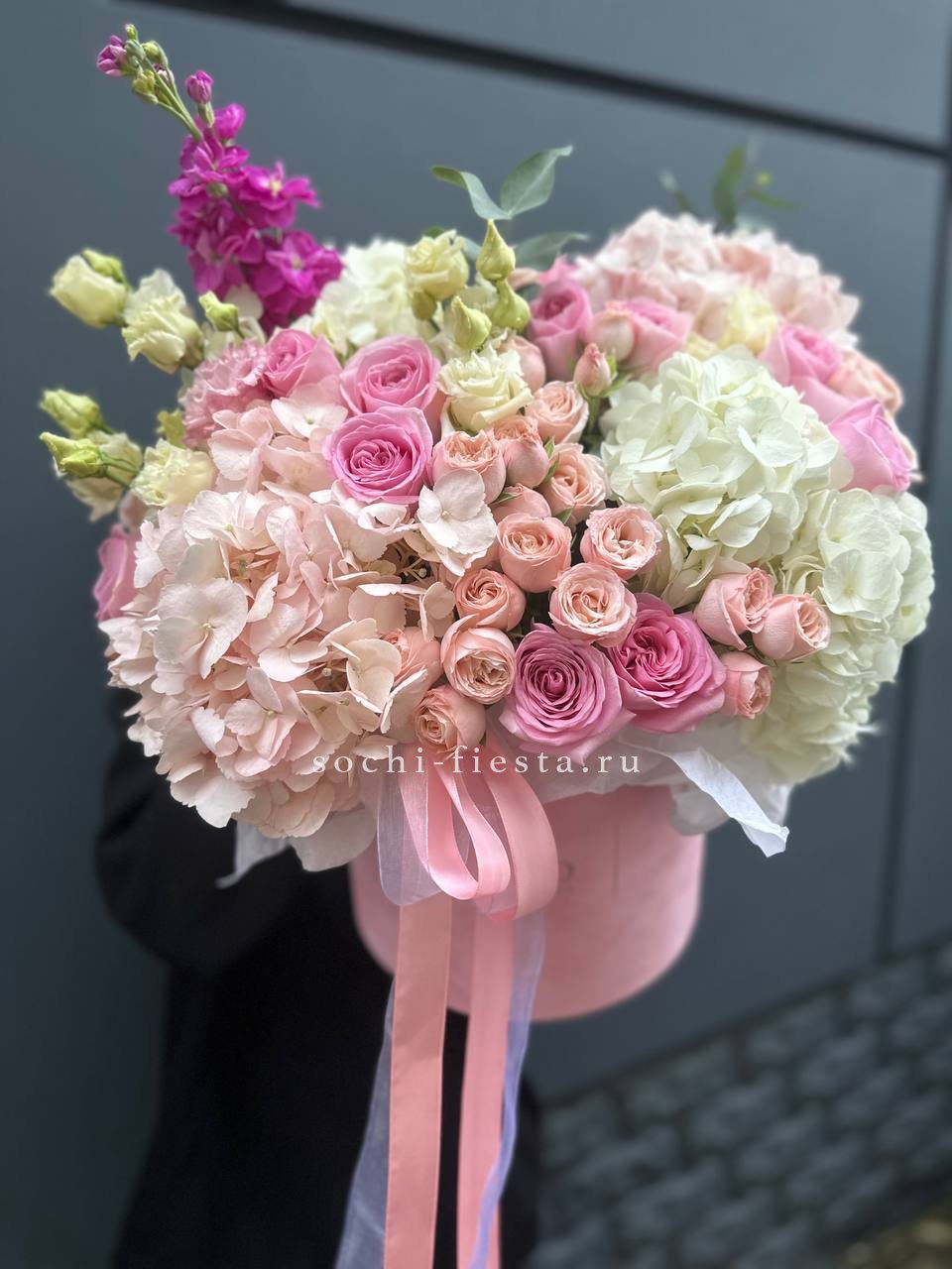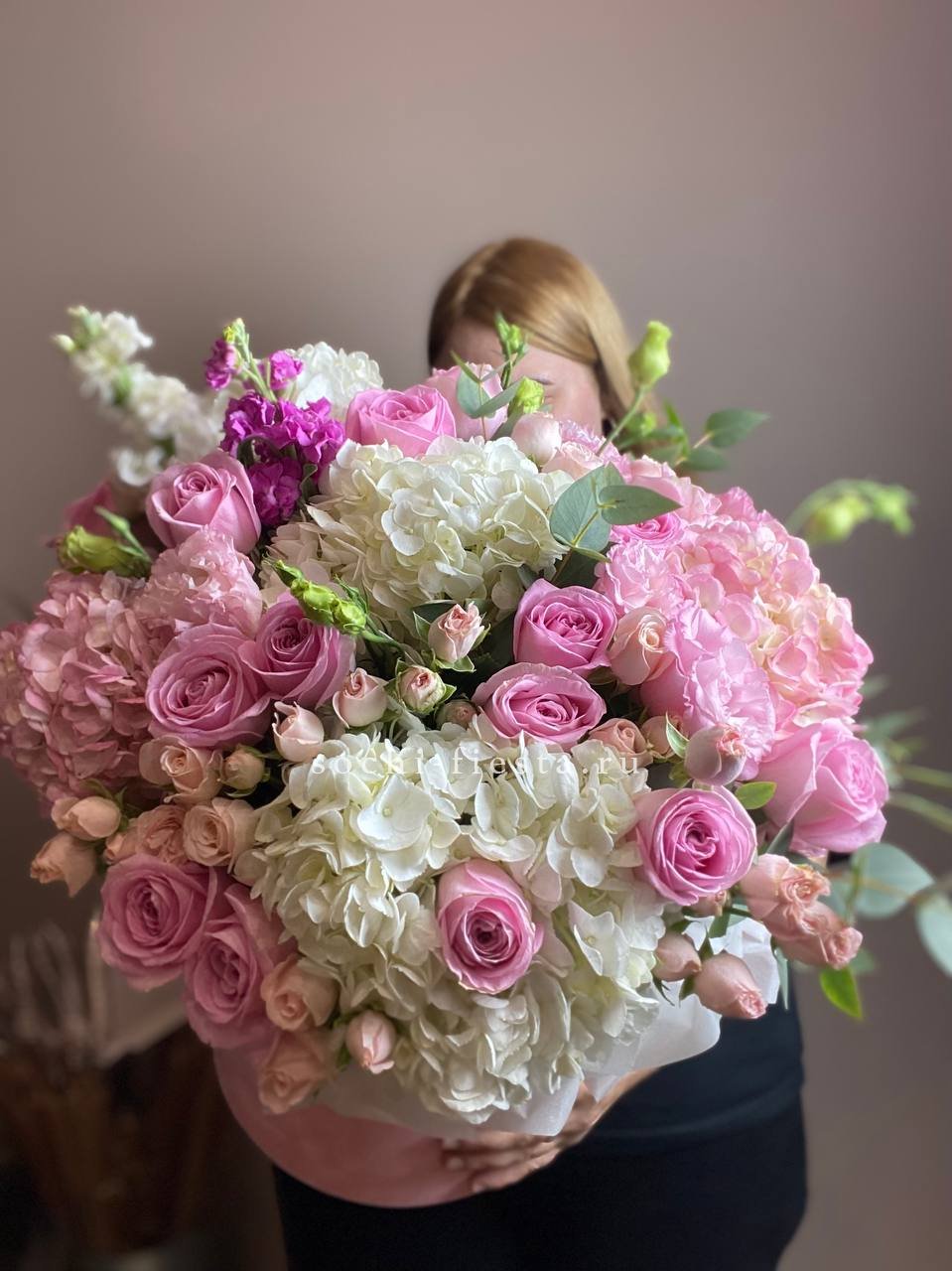 гортензия, кустовые розы, диантус, мисти баблс, эвкалипт, лента, цилиндр D16.