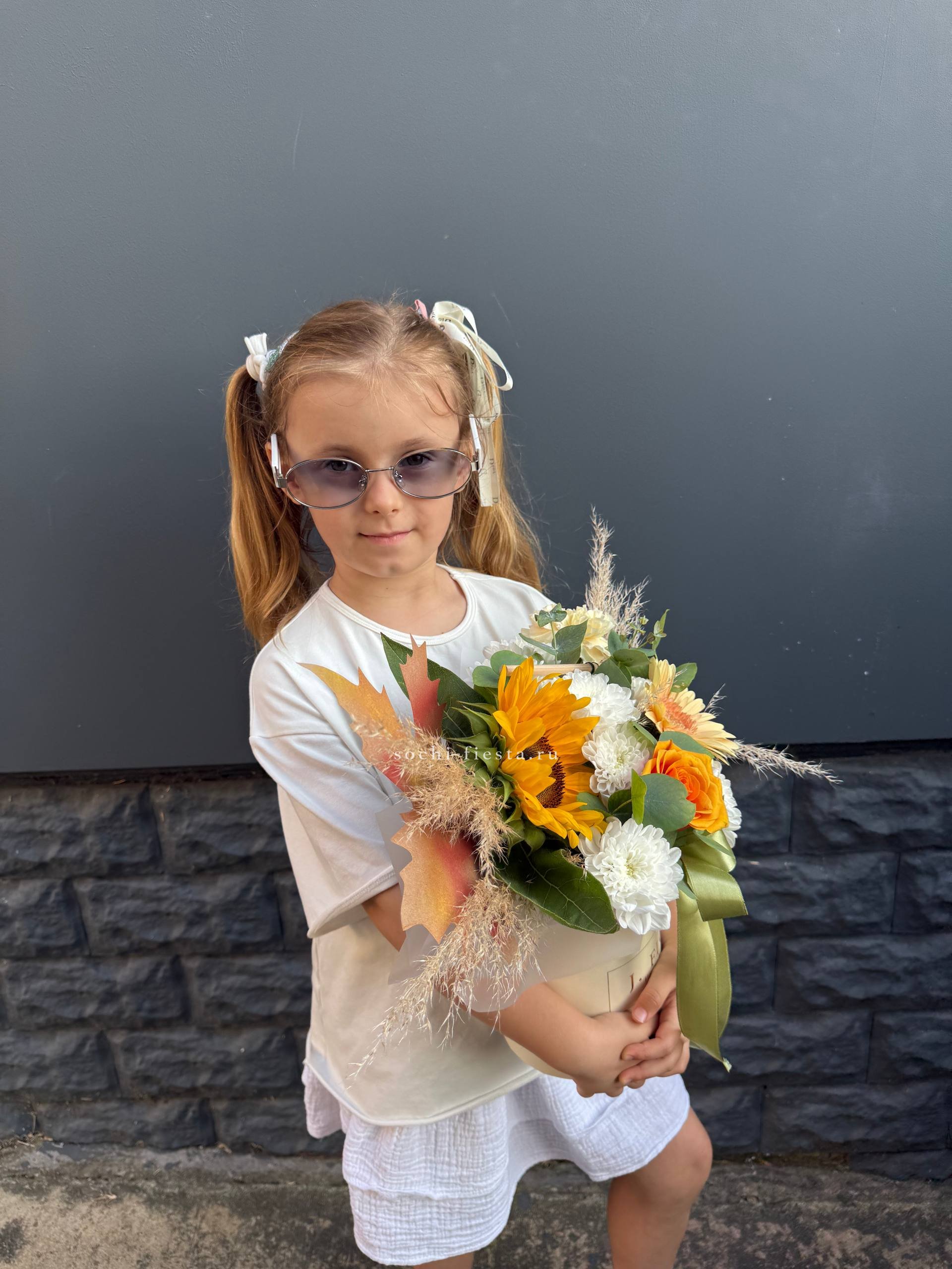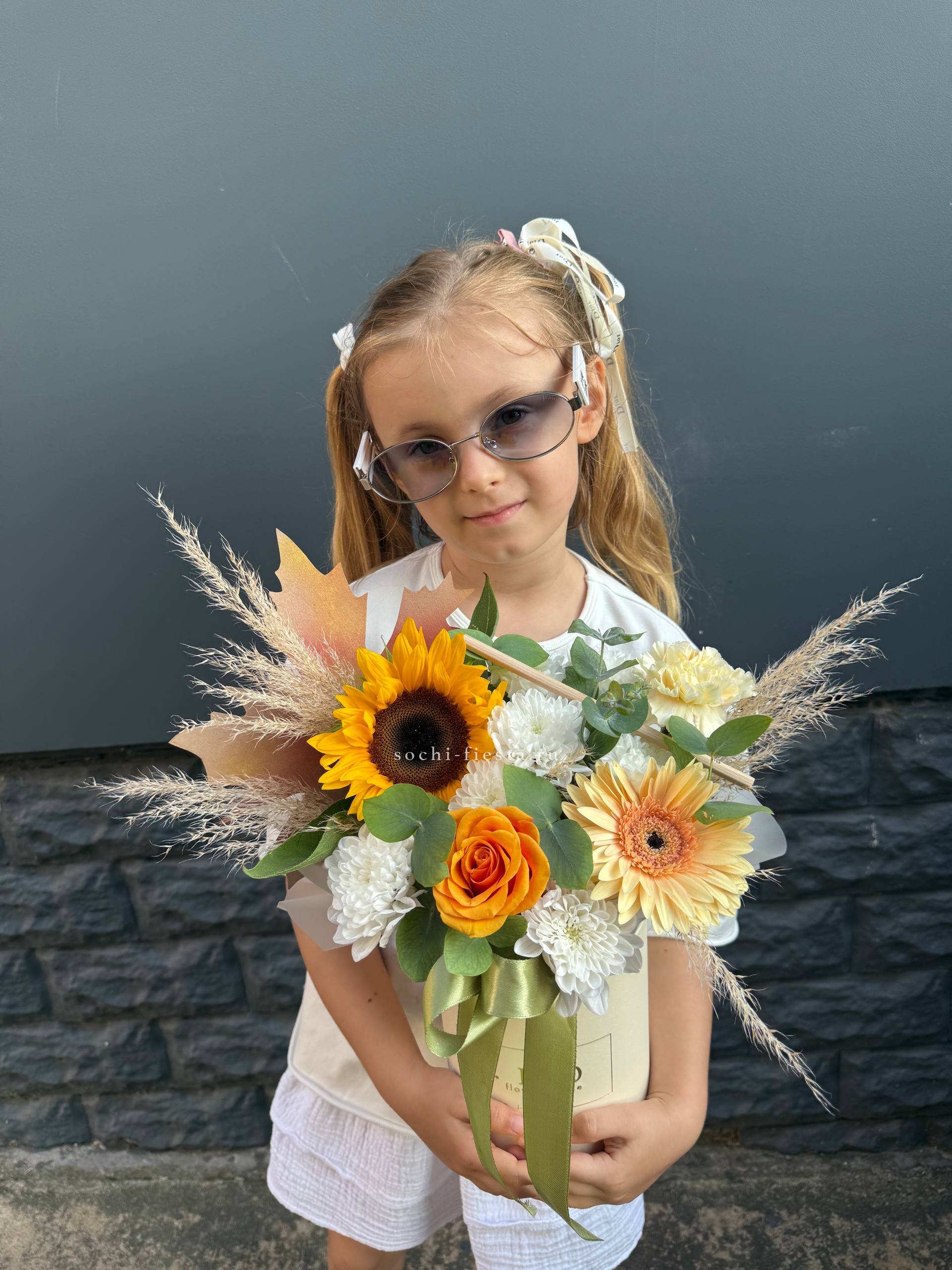 подсолнух, гербера, диантус, хризантема, роза, эвкалипт, декор, коробка D16.