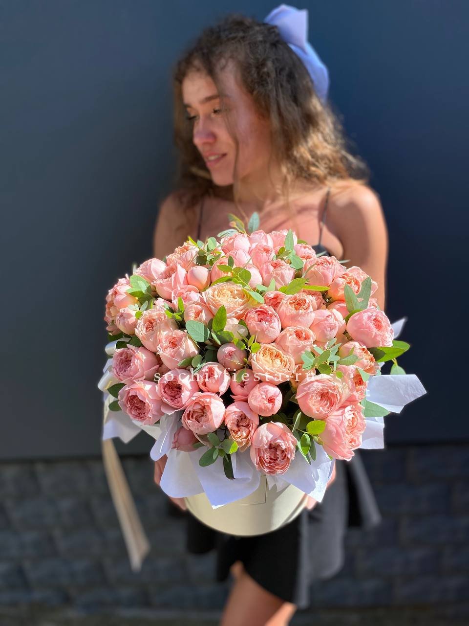 кустовые пионовидные розы сорта Джульетта, цилиндр D20, эвкалипт, лента, тишью.