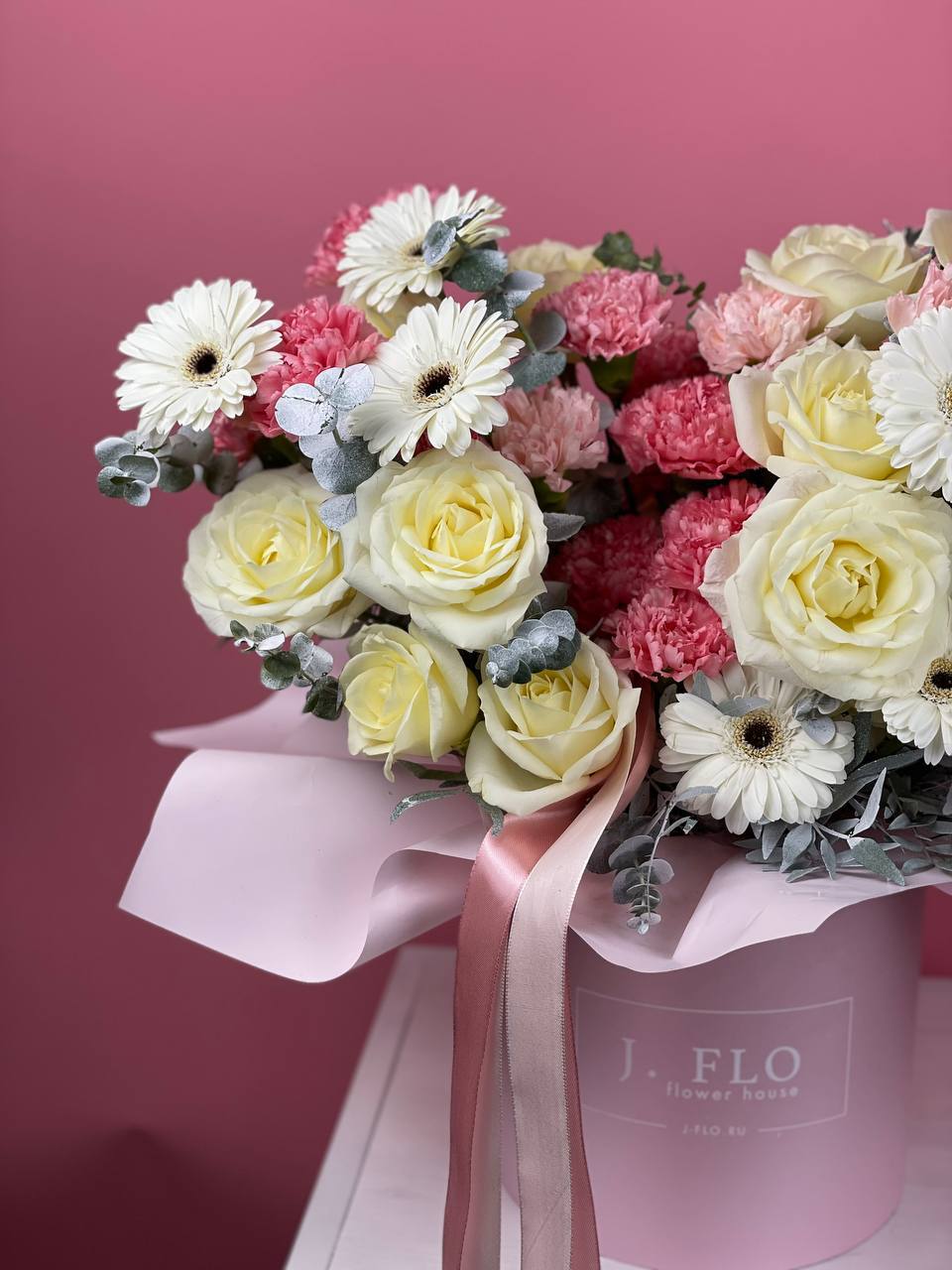Три оттенка в одной композиции: чистота белых роз, яркость гербер и воздушность диантусов. Эвкалипт создаёт мягкий фон для каждого цветка.