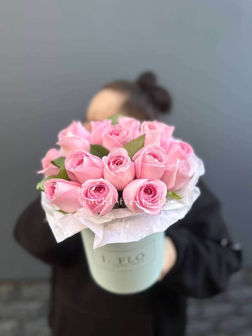 роза, диантус, пионы или гортензия, розы, бомбастик, эустома, декоративная зелень, цилиндр D16.