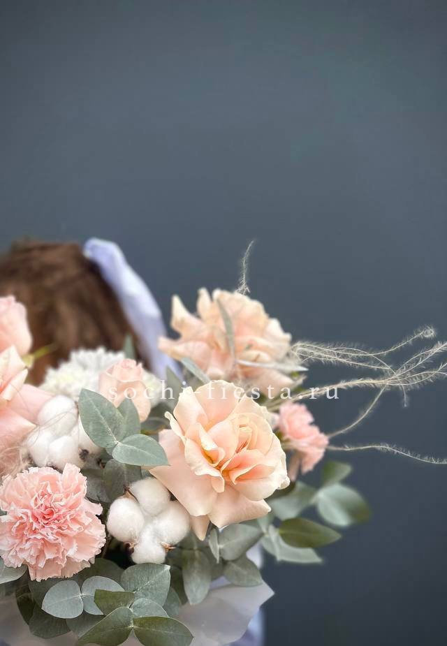 Пионовидные розы раскрывают многослойные бутоны рядом с пышной гортензией и многоцветковой эустомой. Эвкалипт обрамляет композицию мягкими ветвями.