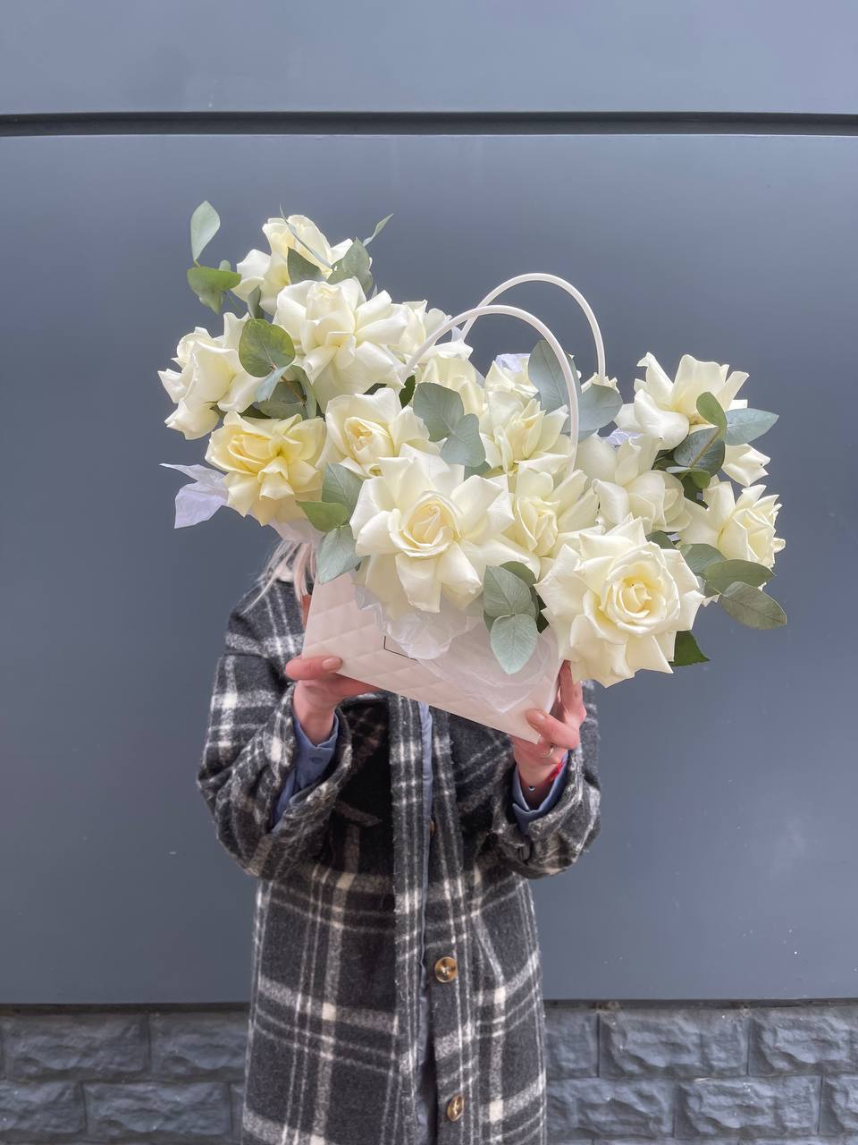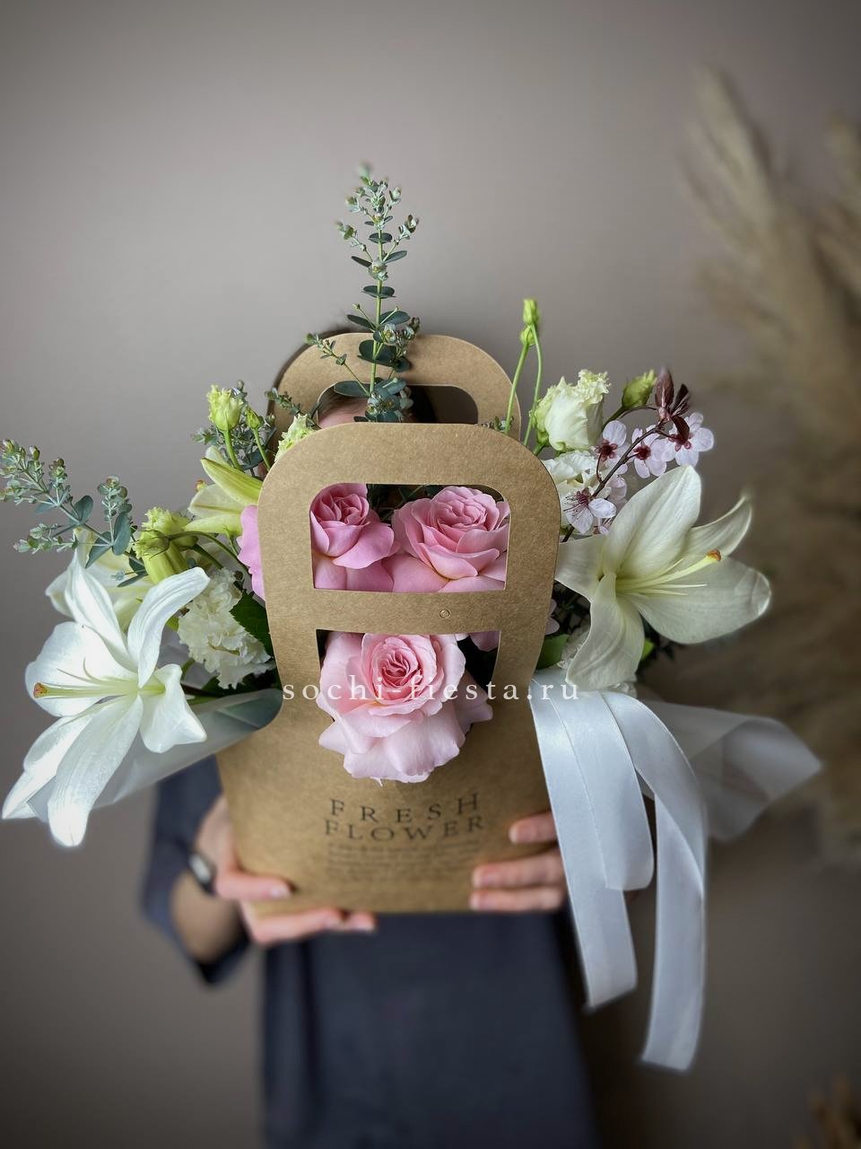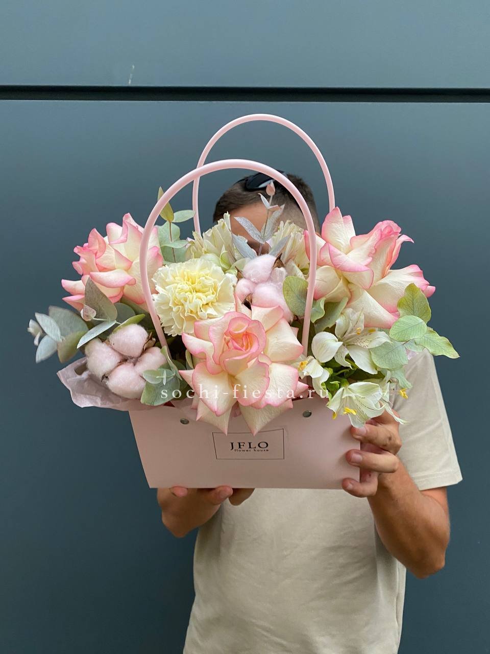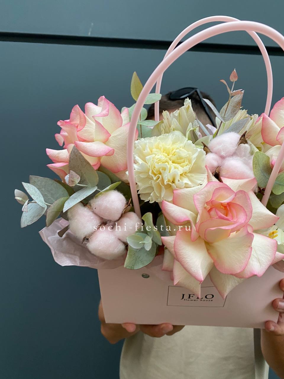 Розовые розы встречаются с орхидеей цимбидиум в объемной сумке-кашпо. Эустома и диантус создают многослойность, а кустовые розы заполняют пространство между крупными бутонами. Композиция держит форму и радует насыщенностью.