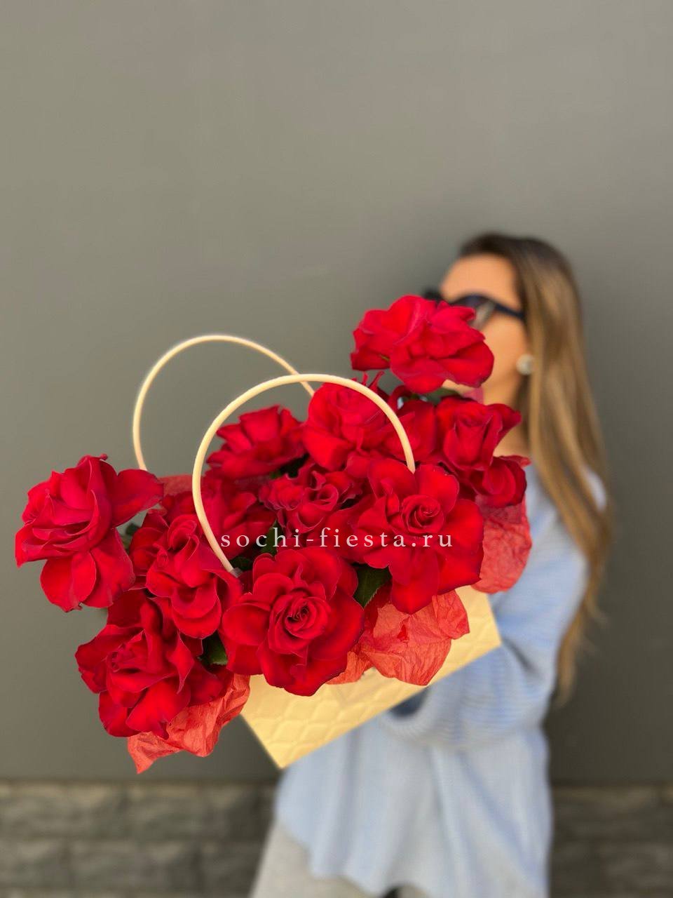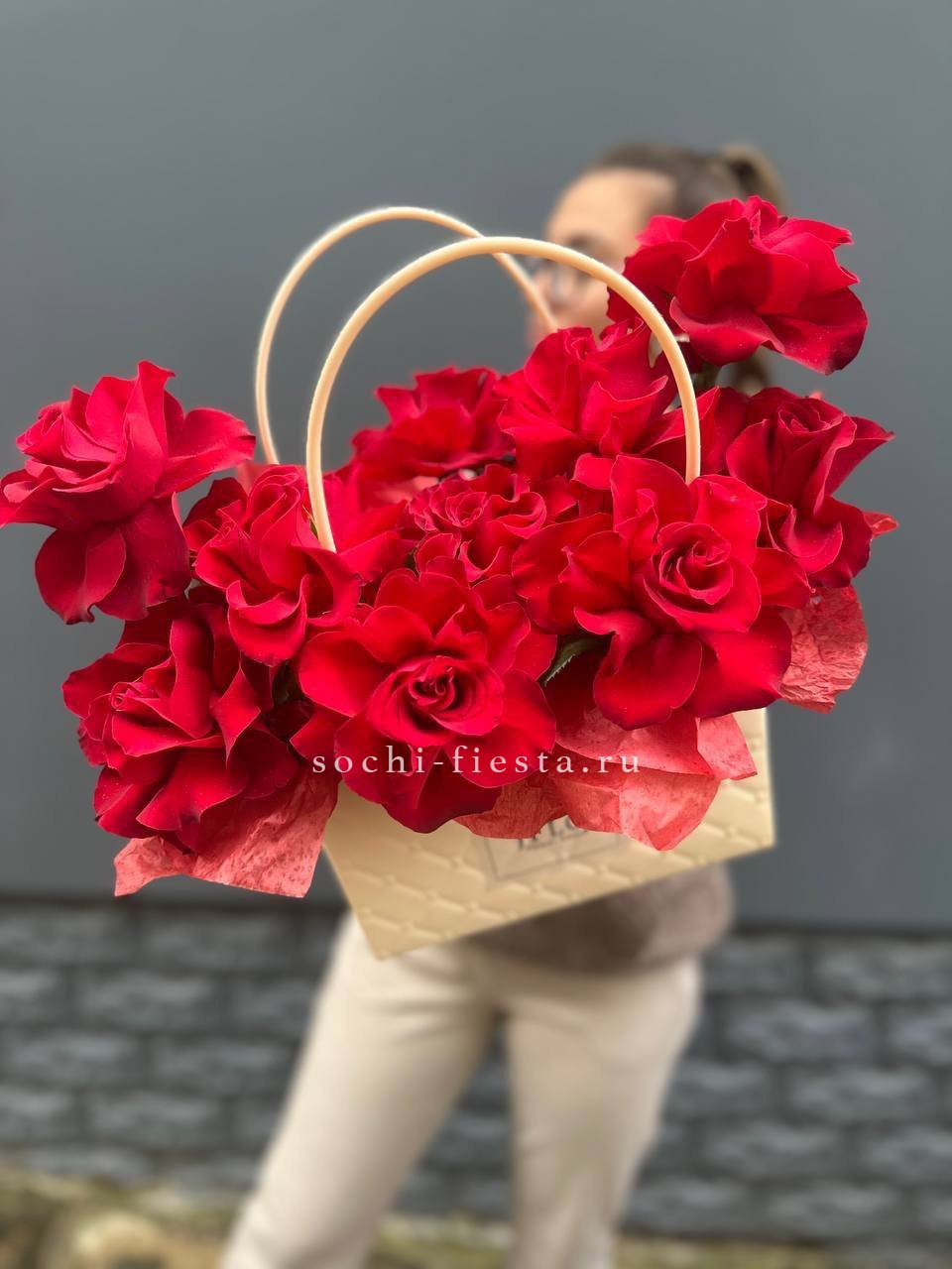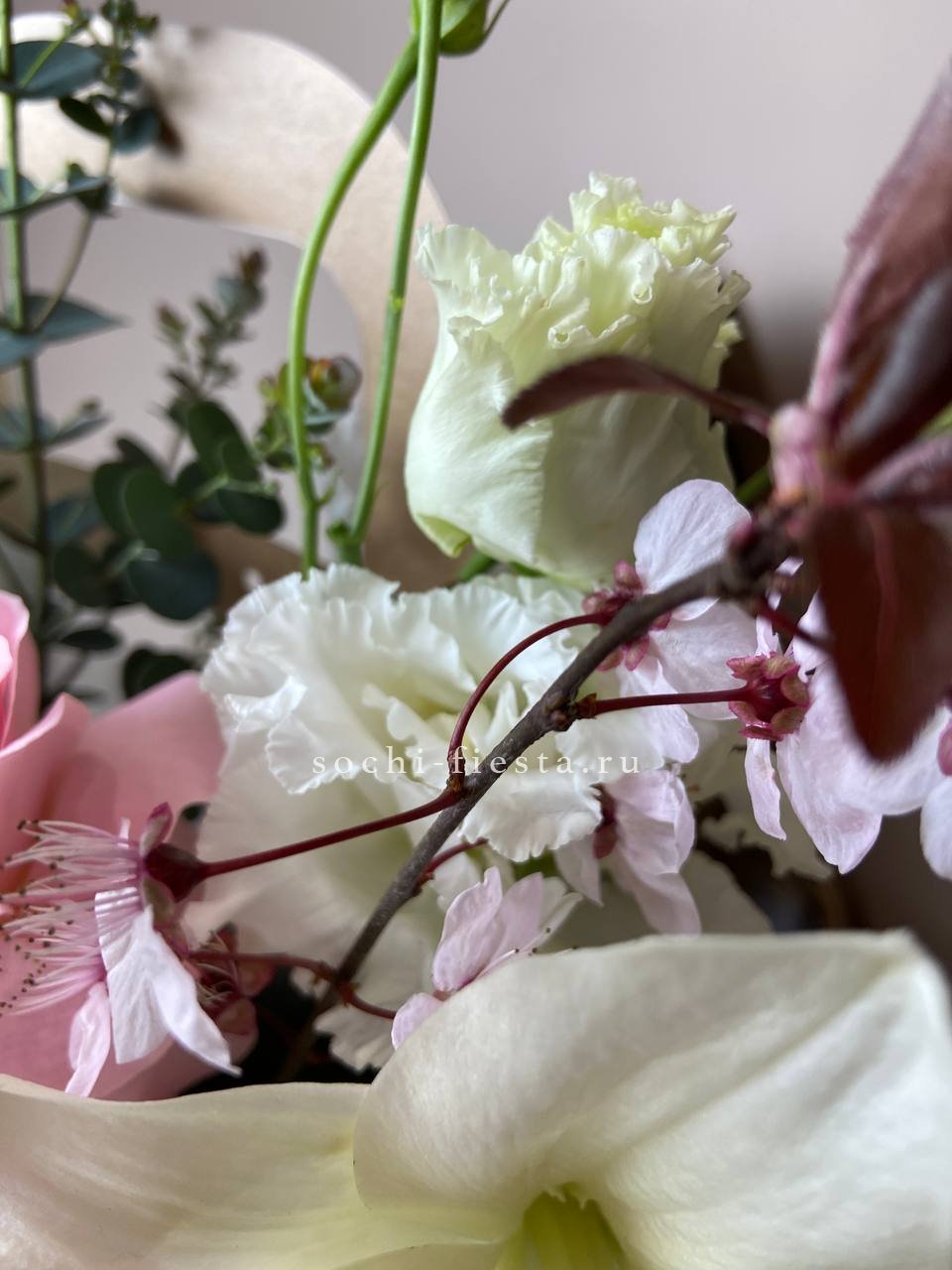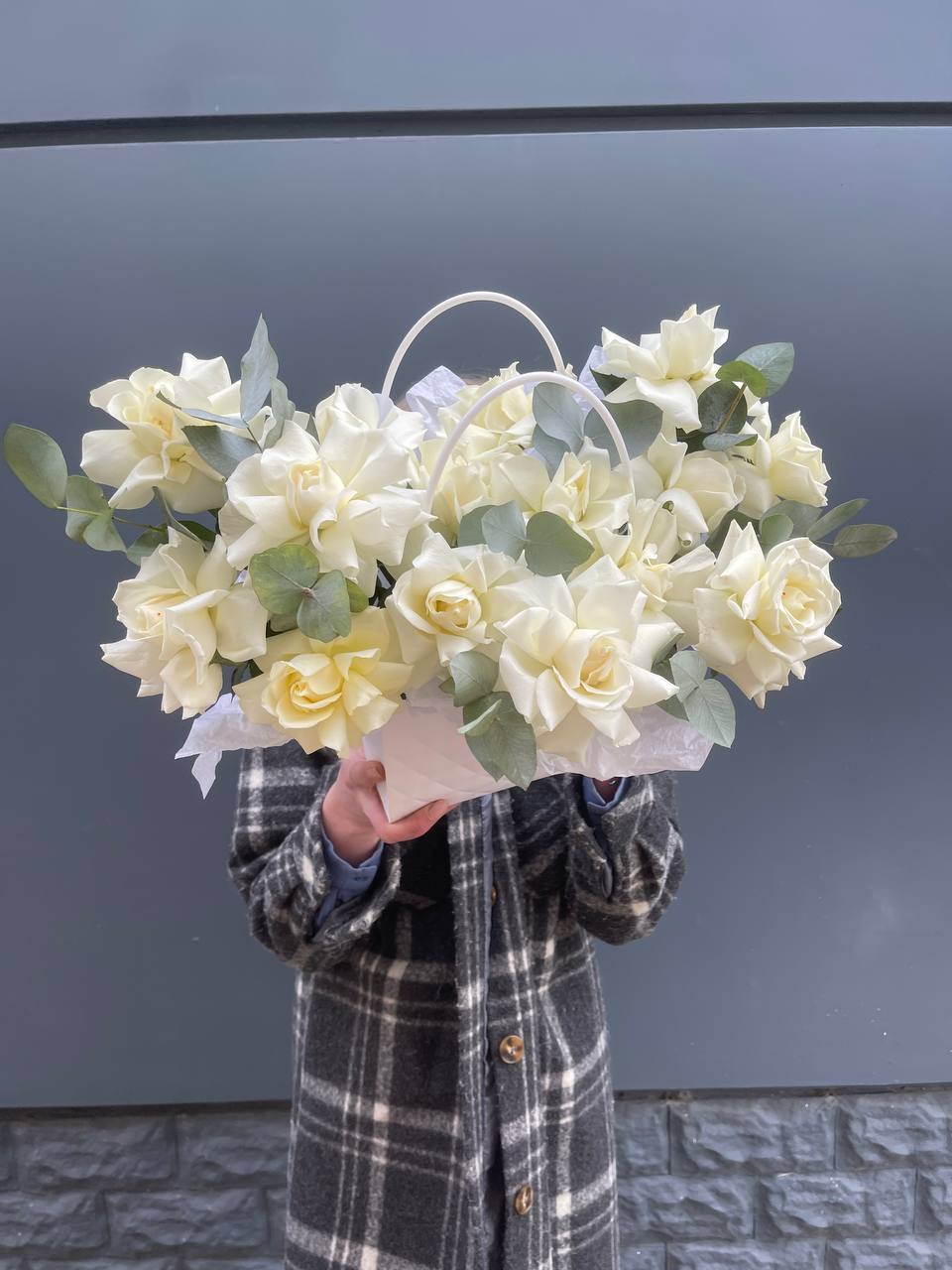 Розовые розы встречаются с орхидеей цимбидиум в объемной сумке-кашпо. Эустома и диантус создают многослойность, а кустовые розы заполняют пространство между крупными бутонами. Композиция держит форму и радует насыщенностью.