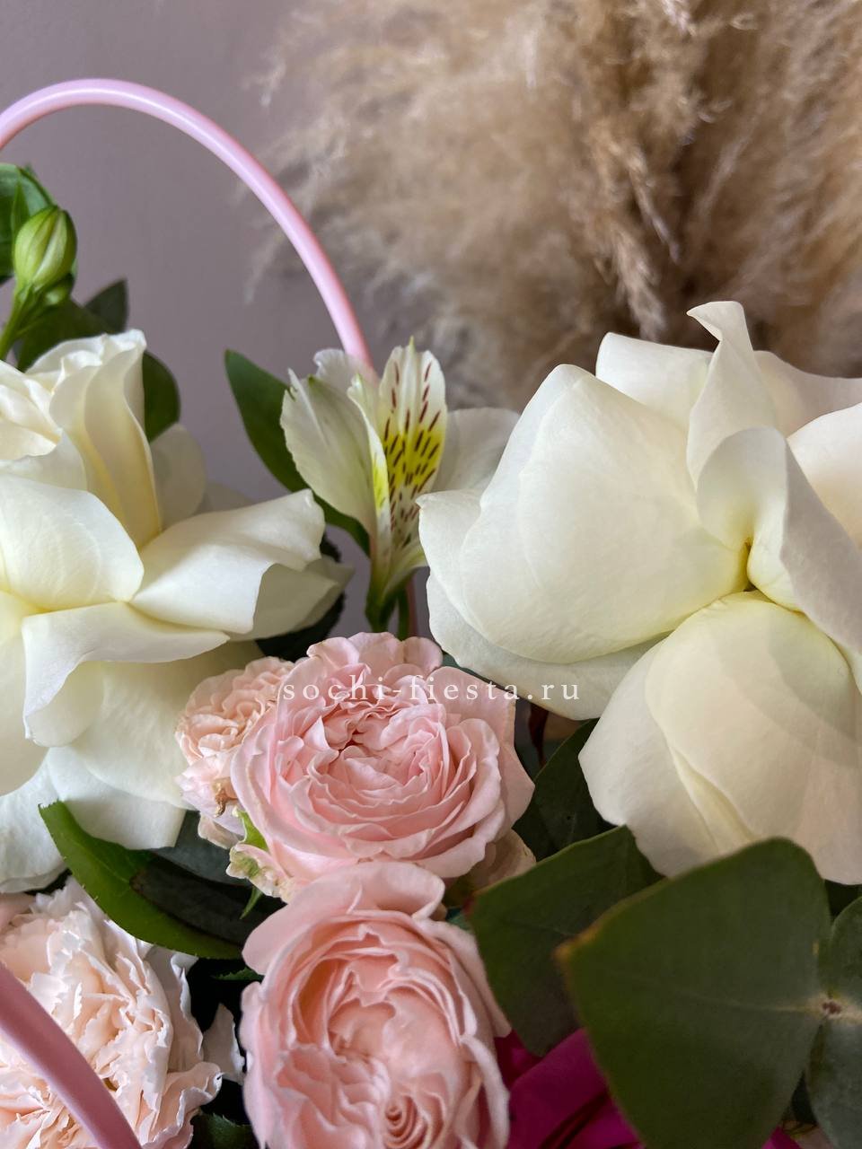 розовая роза, пионовидная роза, диантус, альсромерия, эвкалипт, лента, сумка.
