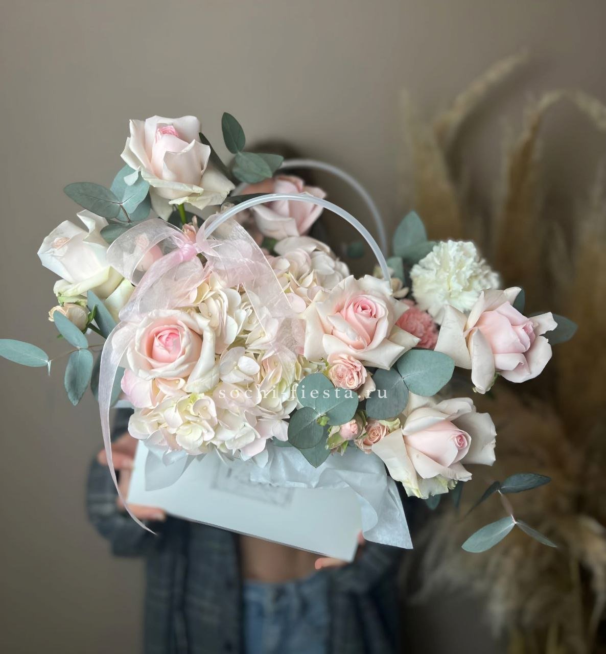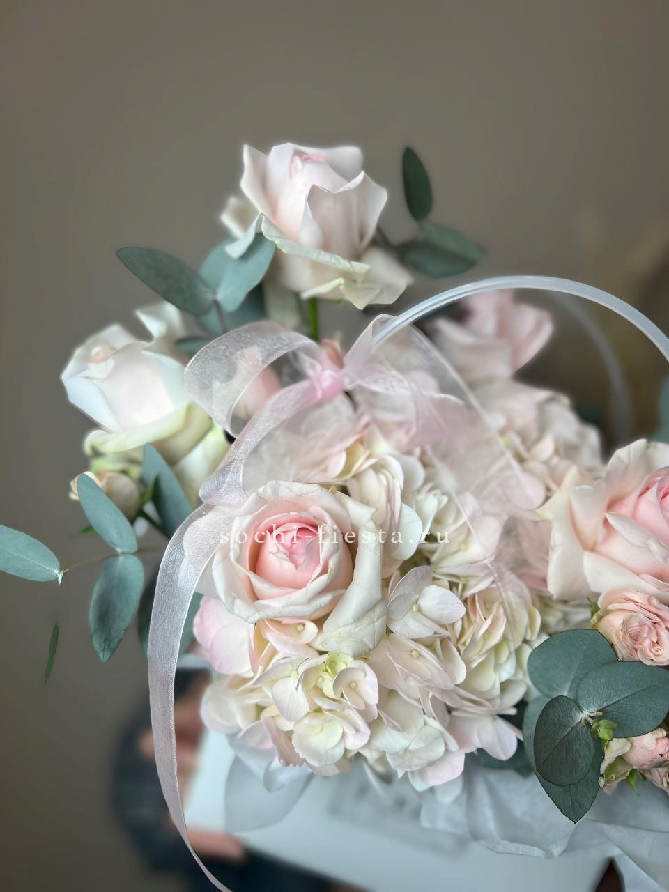 нежная композиция на базе оазиса с применением одноголовых роз, эустомы, гортензии, диантусов, эвкалипта, упаковки.