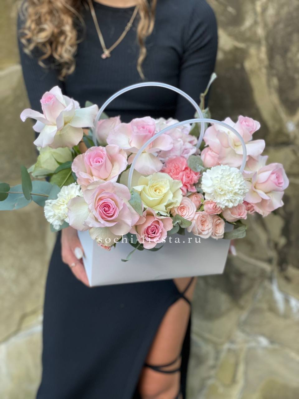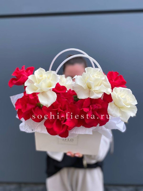 пионовидные кустовые розы, альстромерия, лента, сумка-кашпо.