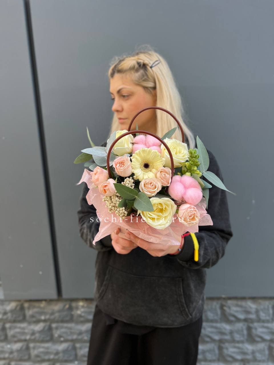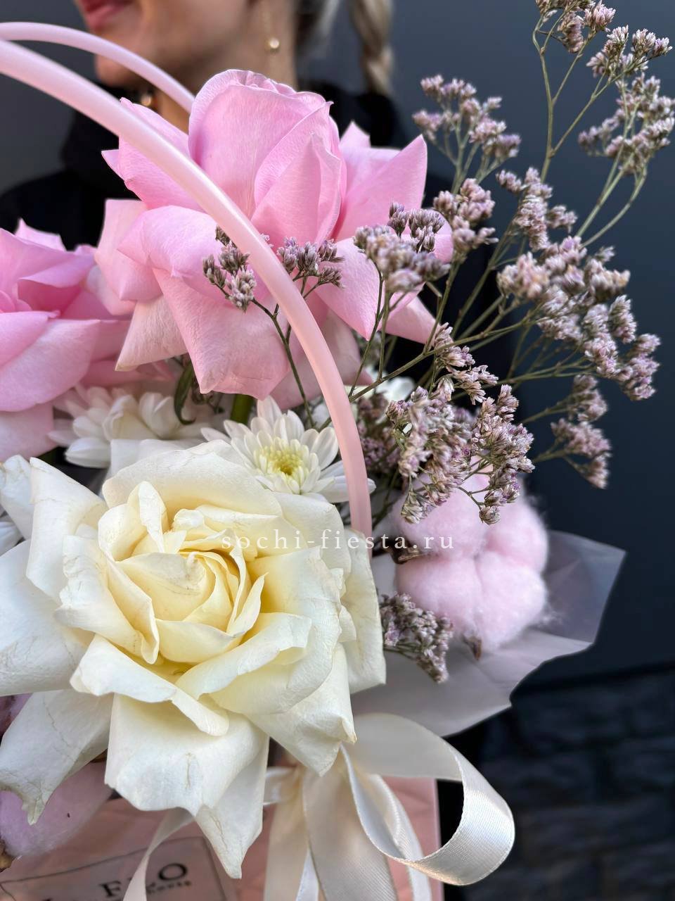 Воплощение изысканности и тренда! Эта стильная композиция в розовой сумочке объединяет в себе яркие цветовые акценты и современный флористический дизайн. Она идеально подойдет для модного образа или в качестве креативного подарка для ценителей необычных решений. Безупречный вкус в каждой детали.
