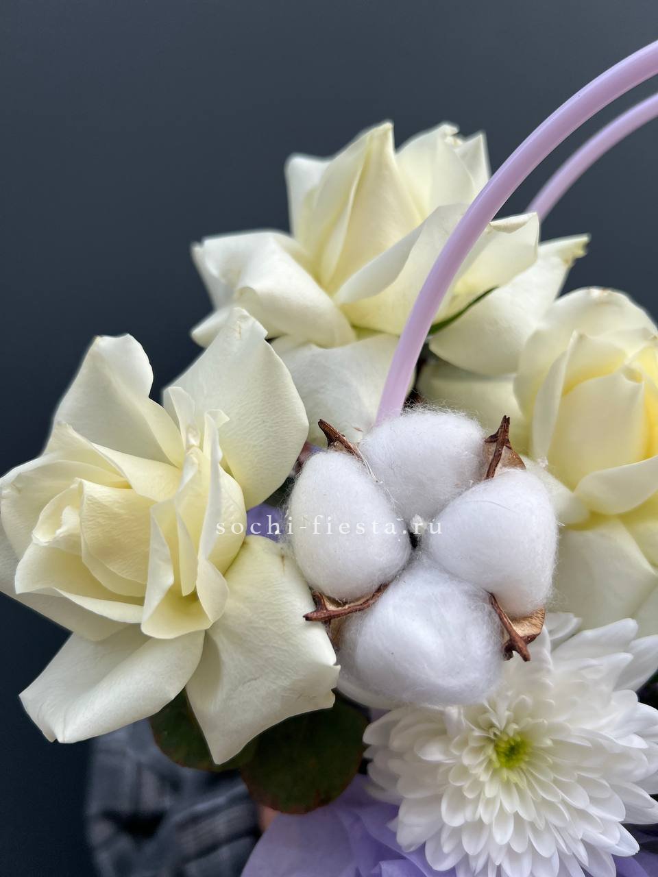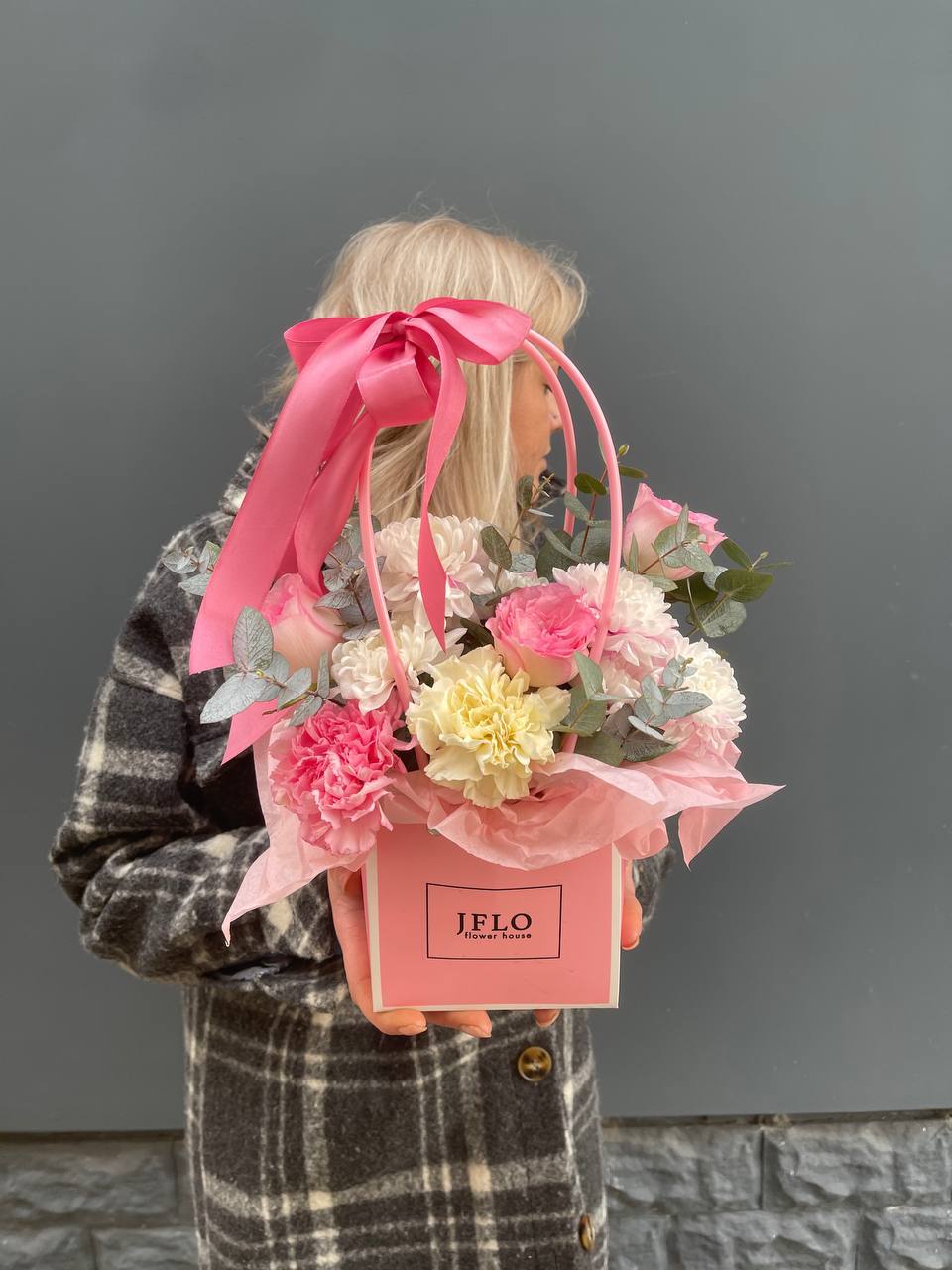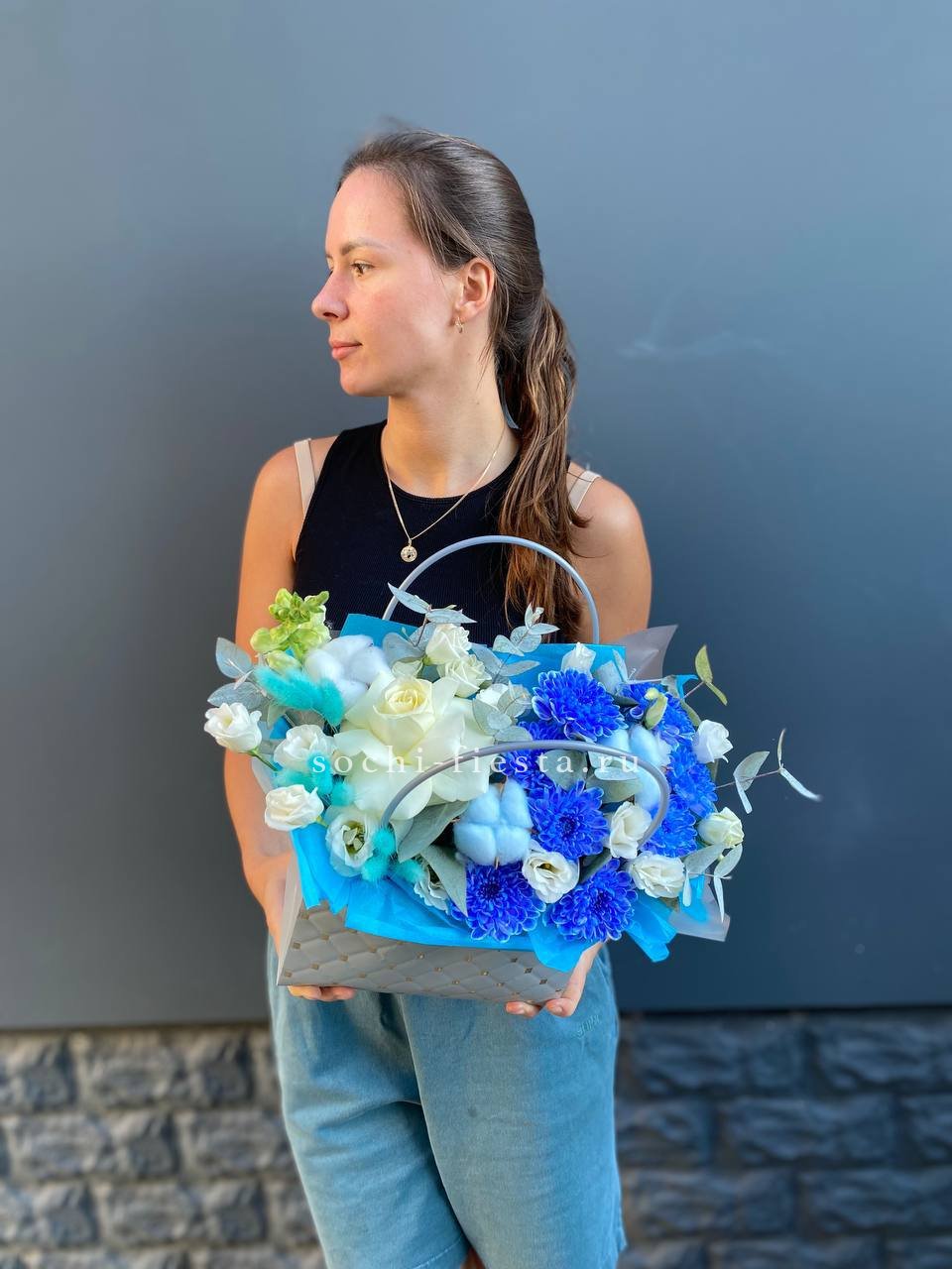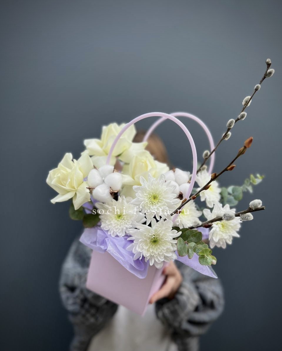 Миниатюрная композиция в удобной сумочке сочетает пышные головки хризантем с бархатистыми розами и воздушным диантусом. Веточки эвкалипта добавляют свежести, а компактная форма позволяет разместить цветы на рабочем столе или прикроватной тумбе.