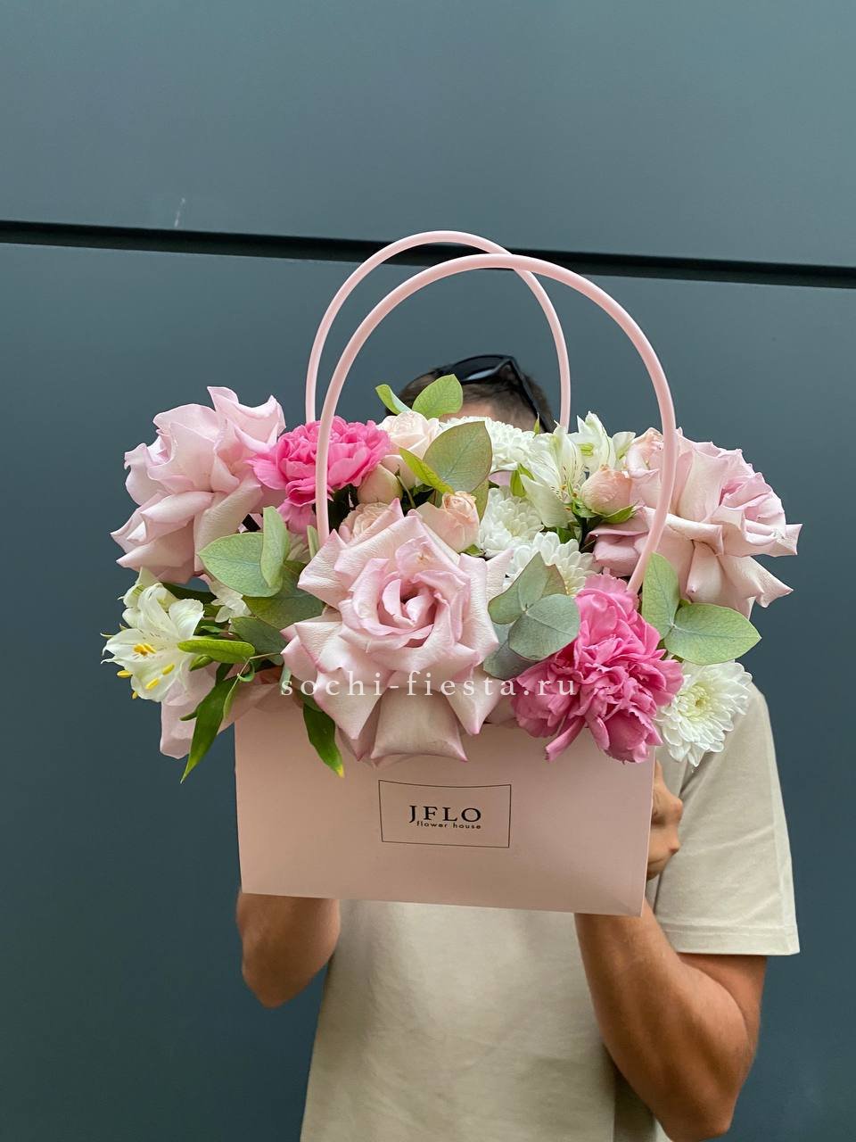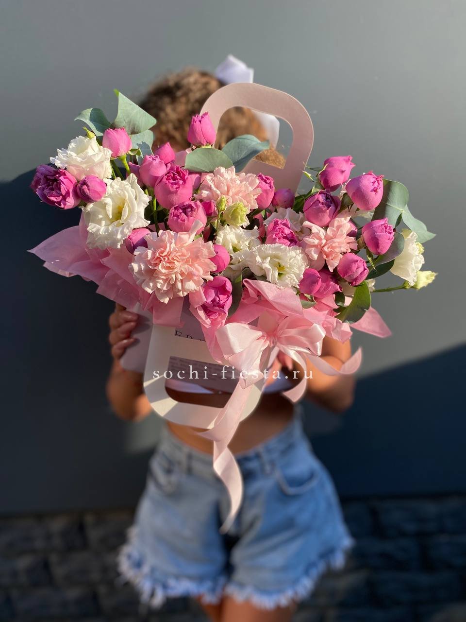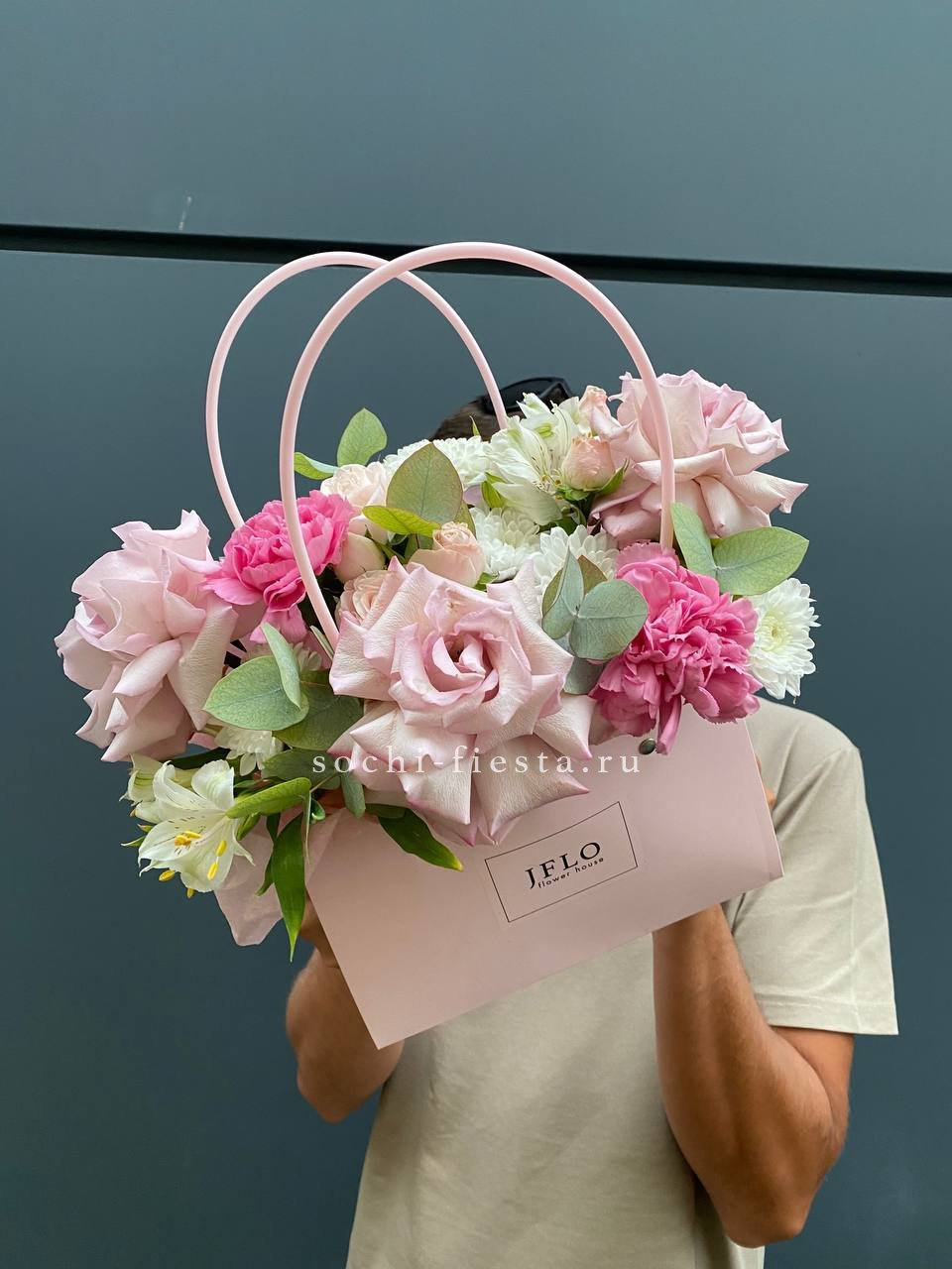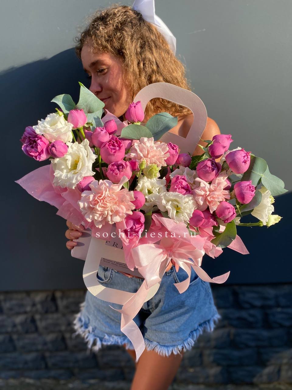 сумочка, хризантема, розовые розы, диантус, эвкалипт.