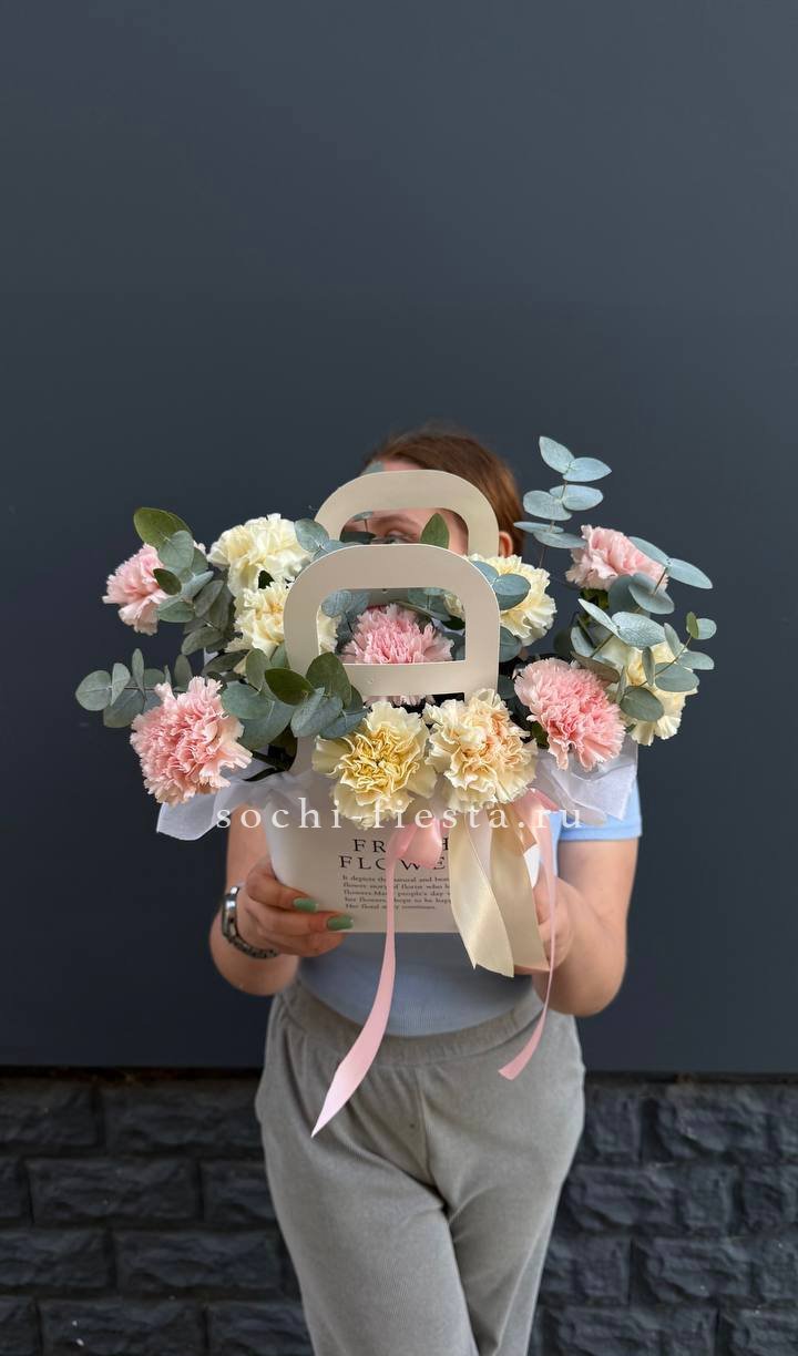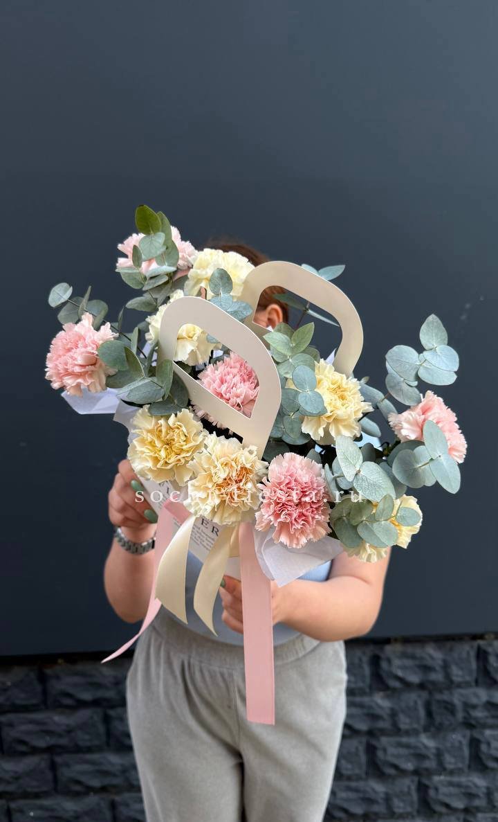 Воздушные головки диантусов собраны в компактную форму с мягкими переходами оттенков. Эвкалипт добавляет свежести и завершает композицию в удобной сумочке.