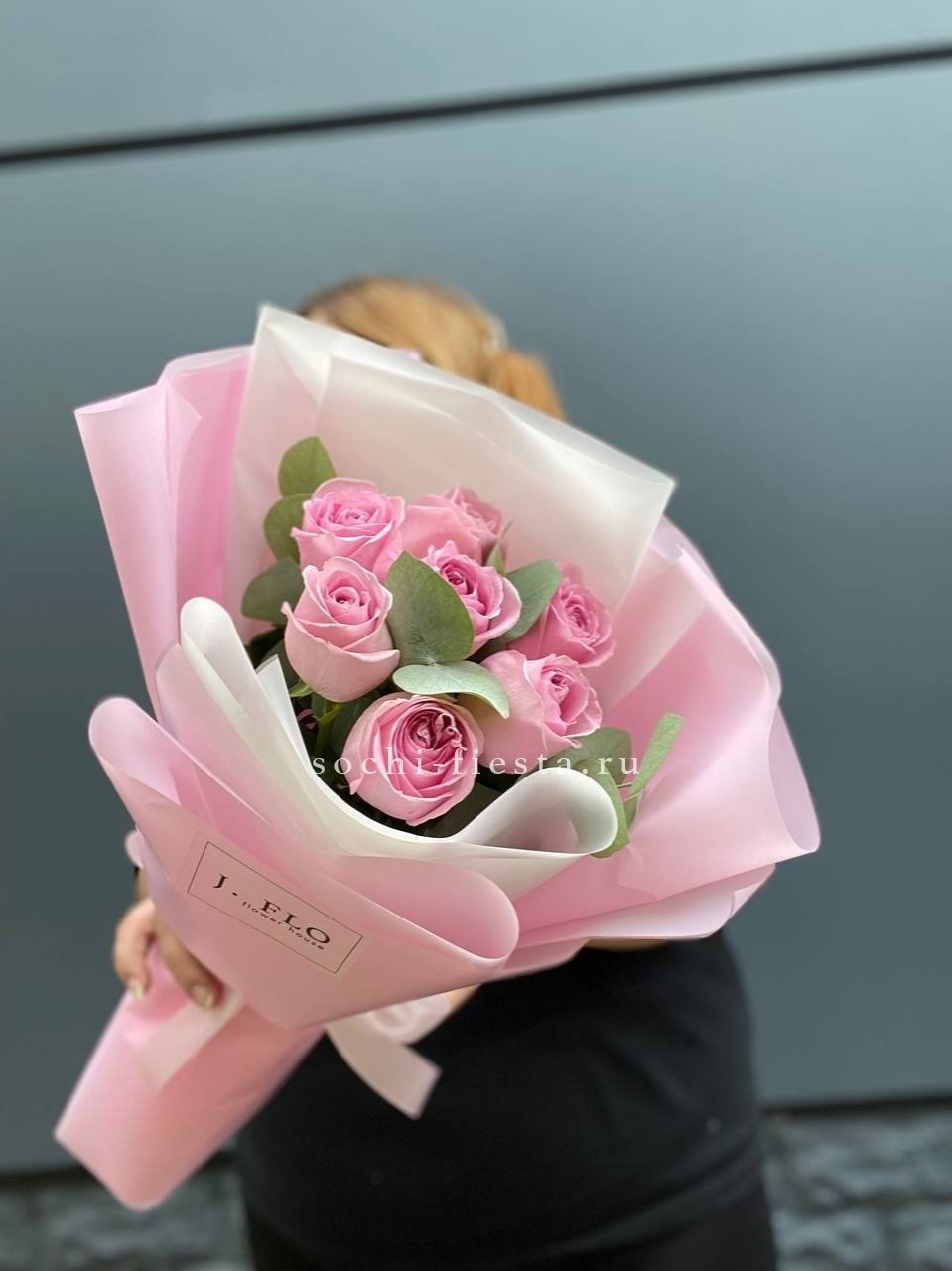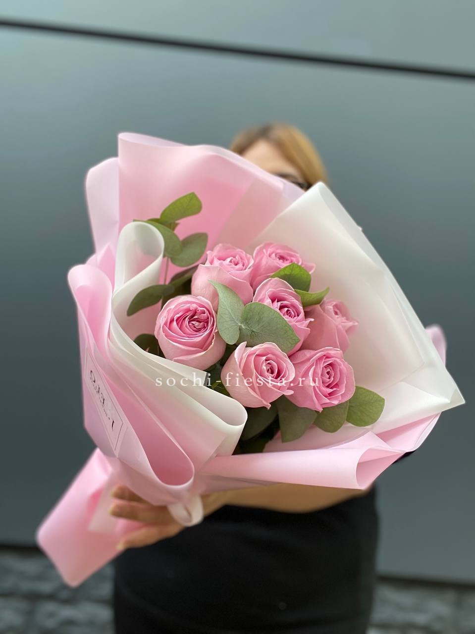 розовая роза - 7 шт., эвкалипт, лента, авторское оформление. Данная цена доступна при единовременном заказе от 10 шт.