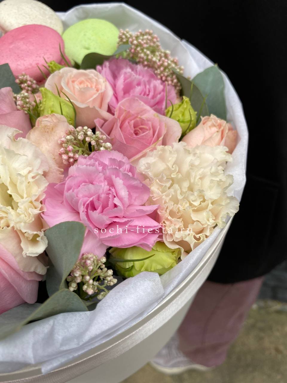 Состав выполнен из пионовидных роз мисти, хлопка, эвкалипта, оформления. Данная цена доступна при единовременном заказе от 10 шт.