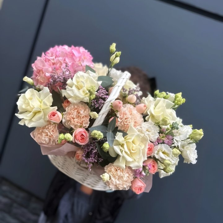 Садовая корзина — главный тренд последних лет. Свободная многовидовая аранжировка в плетёной корзине: эустома, ранункули, нигелла, зелень — ощущение только что срезанных цветов из загородного сада. Покупают те, кто устал от строгих классических форматов и ищет природной органики и лёгкости в подарке.