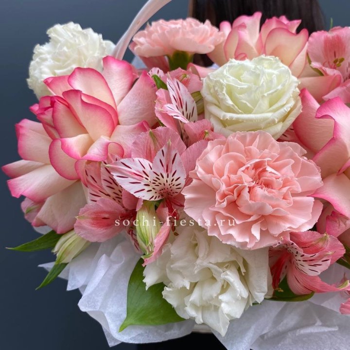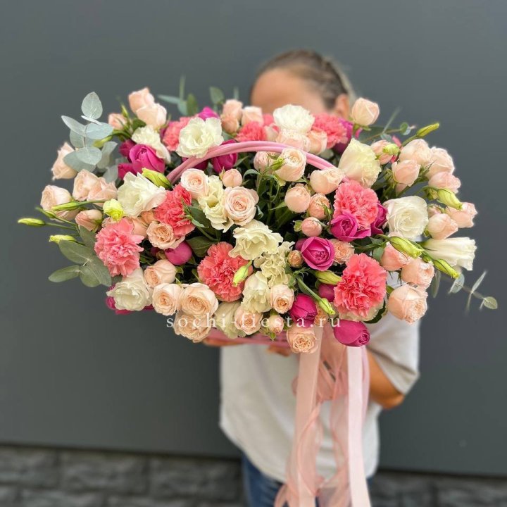 Состав корзин в Саранске определяется текущими поставками и сезоном. Розы Freedom, Mondial, Cappuccino — для классических куполообразных аранжировок. Пионы в мае-июне из свежих поставок: Sarah Bernhardt, Red Charm, Bowl of Cream — главный сезонный продукт. Хризантема, альстромерия, гербера — для объёмных торжественных наполнений. Эустома, ранункули — для садовых корзин. Флорист строит состав под конкретный запрос.
