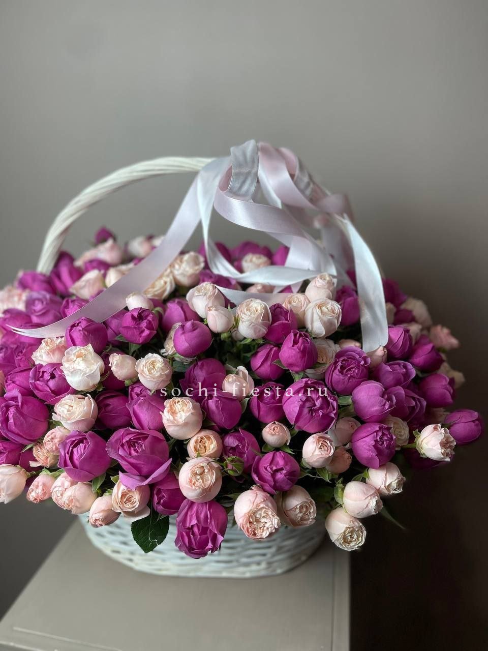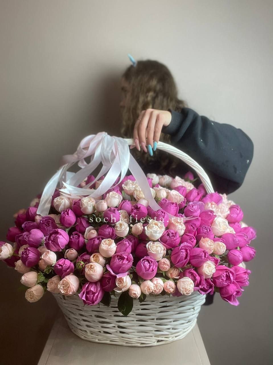 Пышная корзина с розами и гортензией раскрывается мягкими переходами розовых тонов. Эустома и диантус добавляют воздушности, а эвкалипт создает свежую основу для многослойной композиции. Авторская работа для важных событий и значимых встреч.