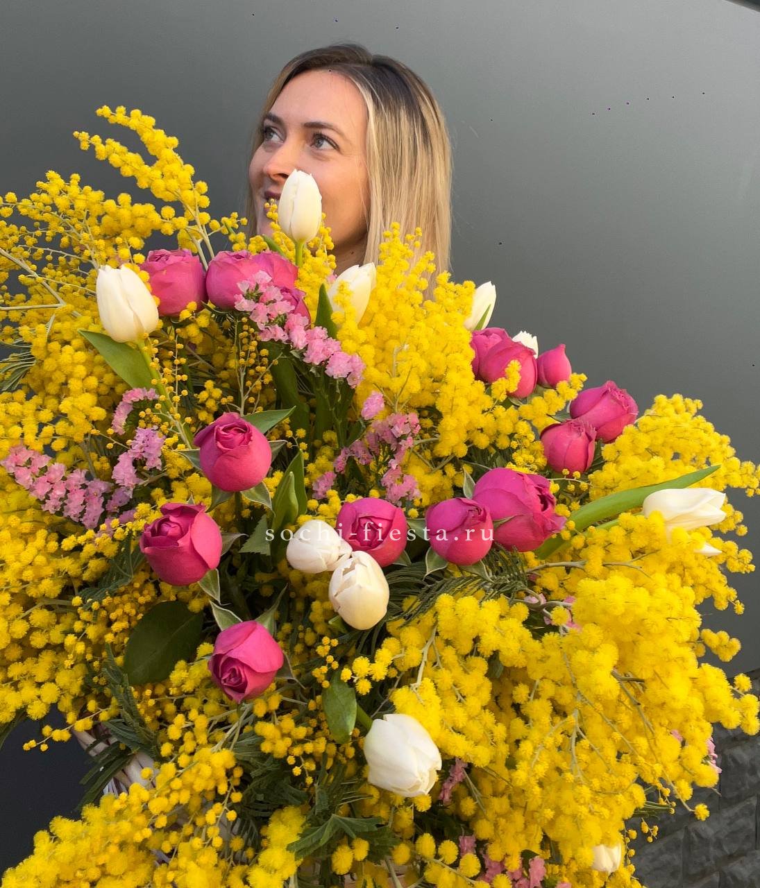 Солнечная мимоза встречается с тюльпанами и пионовидными розами Мисти Бабблс. Весенняя палитра собрана в корзине, где каждый цветок занимает свое место в общем ритме.