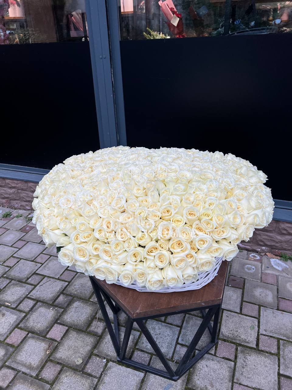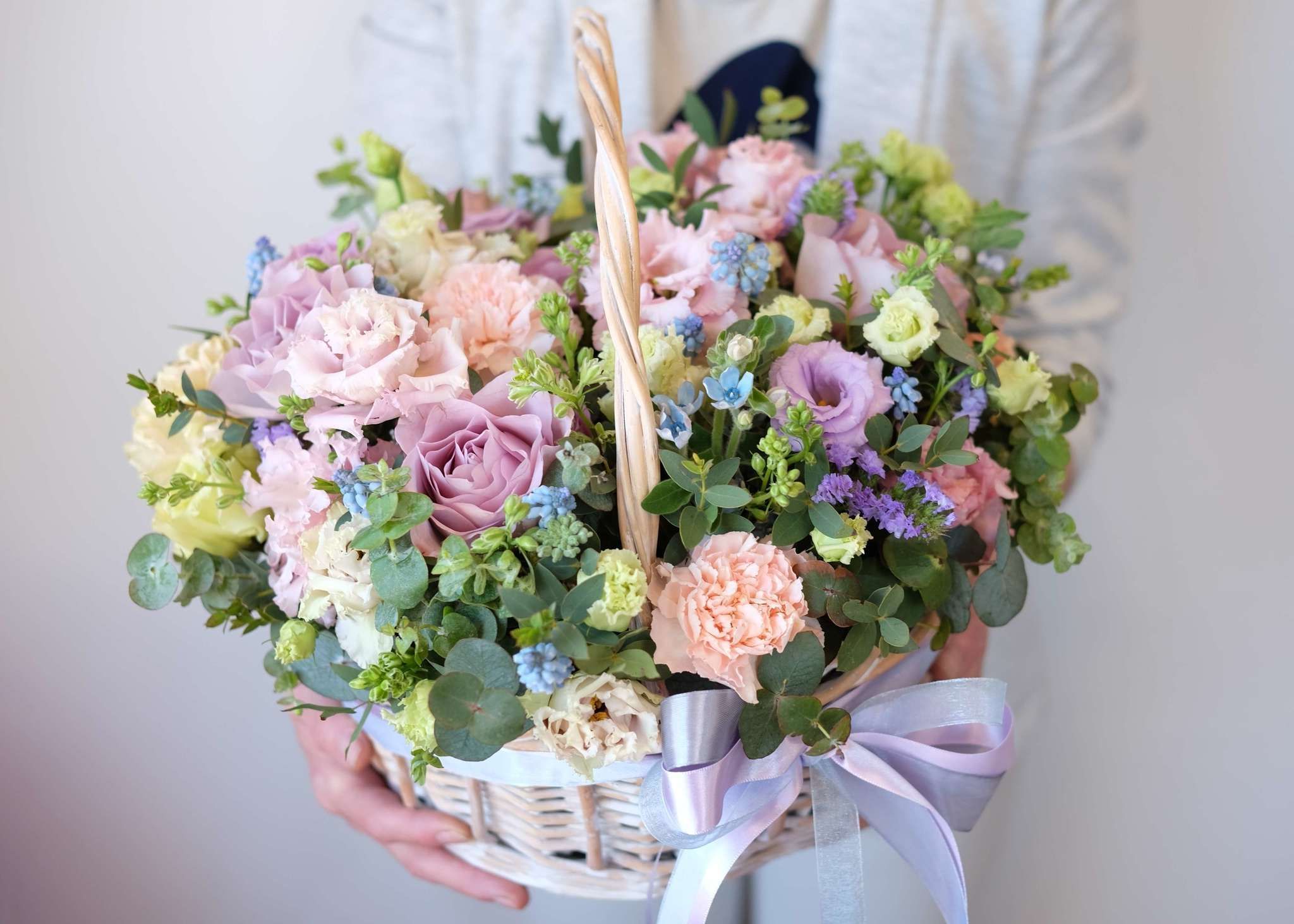 Белые розы и эустома образуют воздушную композицию с мягкими переходами между соцветиями. Хризантемы и маттиола добавляют объема, а гипсофила создает легкую дымку по краям. Корзина выглядит свежо и собранно в любом пространстве.