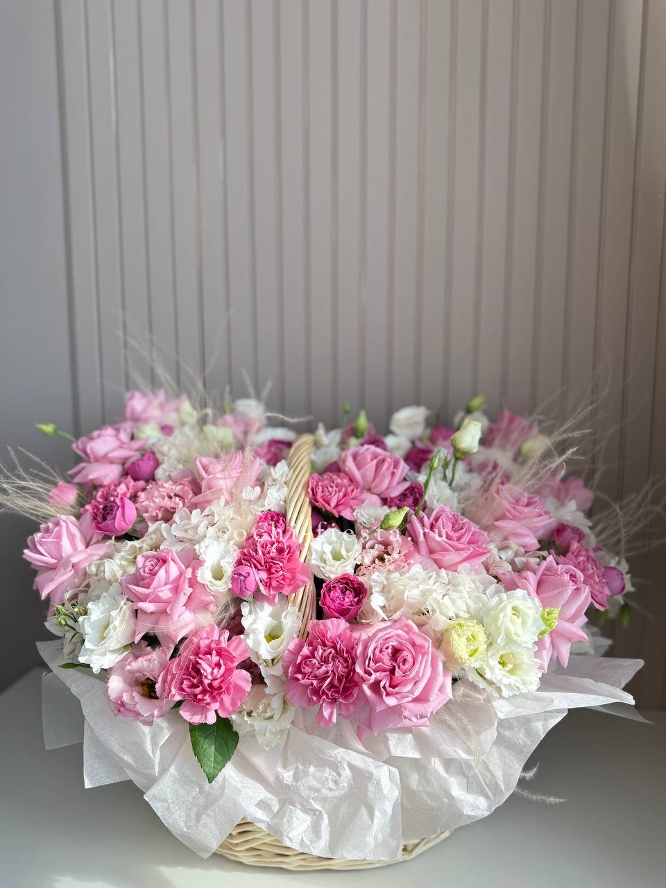 Гортензия и эустома задают объём, а яркие герберы расставляют цветовые акценты по всей композиции. Диантус и хайди добавляют воздушности, эвкалипт завершает силуэт мягкими линиями. Корзина держит форму и создаёт устойчивую основу для пышной композиции.
