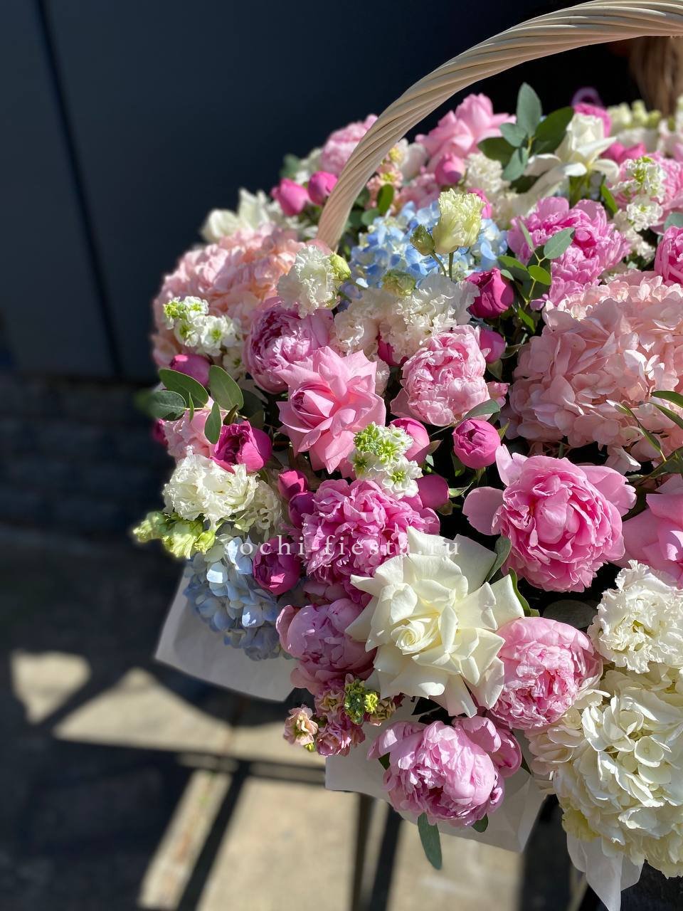 Монументальная композиция из полутора сотен белоснежных бутонов создает впечатление цветочного облака. Корзина придает устойчивость и завершенность форме, позволяя разместить такой масштабный ансамбль в любом пространстве.